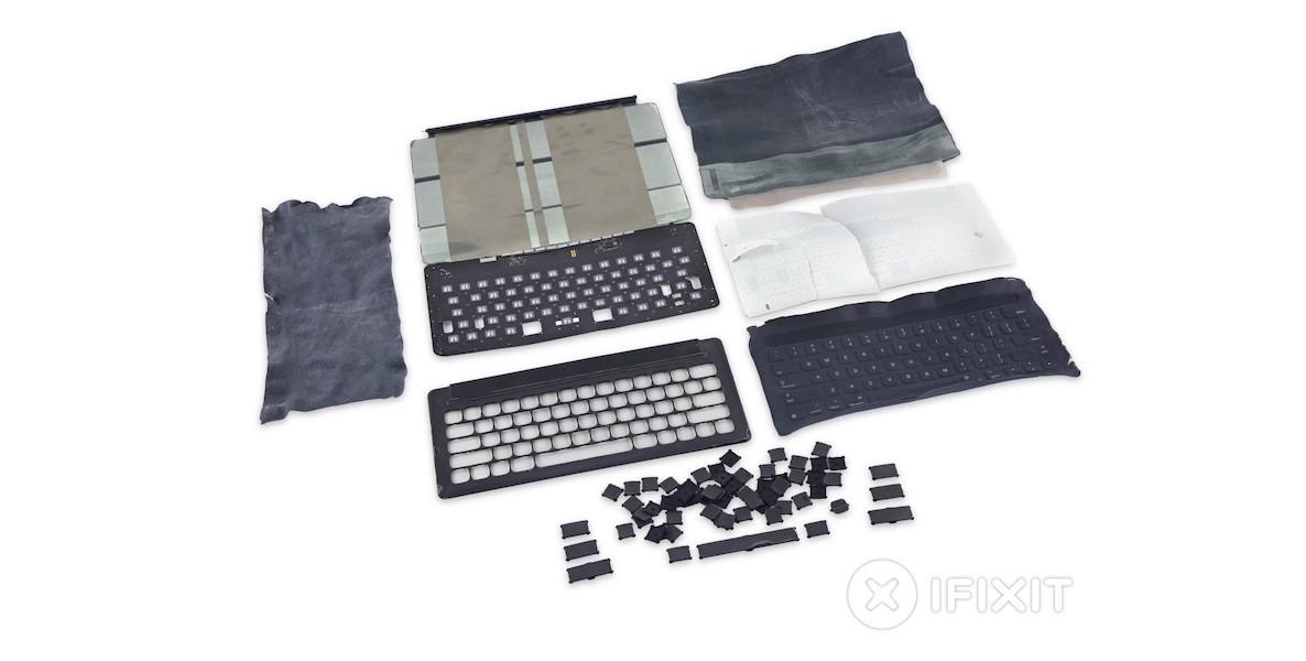 The teardown pros iFixit have already opened up Apple's new iPad Pro, as well as the Apple Pencil, so the only other major accessory for the tablet awaiting the treatment was the Smart Keyboard. iFixit published its impressions of the Smart Keyboard this week, sharing photos of the keyboard and smart cover combo in its progressive state of disassembly. Seeing as how it's made of layers of fabric and plastic sewn together, it really isn't meant to be taken apart, and thus scored very poorly in the site's repairability category.