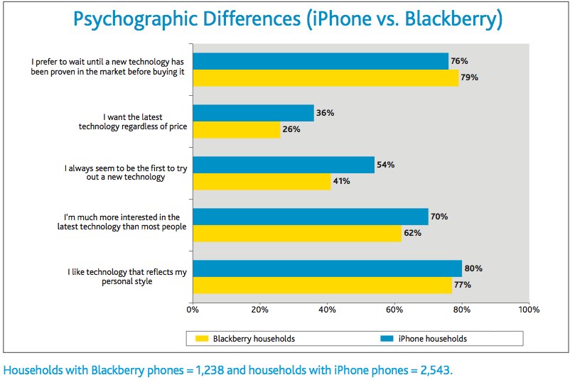 Nielsen reckon 15-percent of American households have a smartphone, and point to the BlackBerry's earlier introduction as a key reason for its higher comparative market share. When questioned about being considered "bleeding edge" adopters, iPhone owners were more likely to rank themselves keener on trying new technology than their more cautious RIM-buying counterparts.