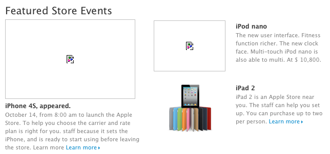 It appears that someone in Japan is about to be in big trouble as their front page now features both the soon-to-be-revealed iPhone 4S and what may be a new iPod Nano. This page also lets us know that October 14th will be the launch date for this new iPhone model (at least in Japan) and one step deeper you'll find that the price has been lowered from 13,800 yen to 10,800 yen. Also note: Apple USA has done some much less suspicious leaking of the same device, this time in uploading images of the iPhone 4S to their servers – of course some intrepid fans found them quickly.