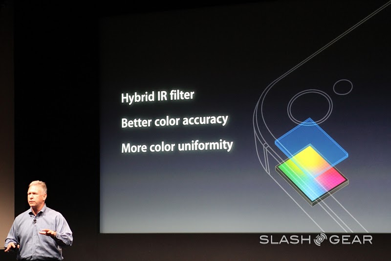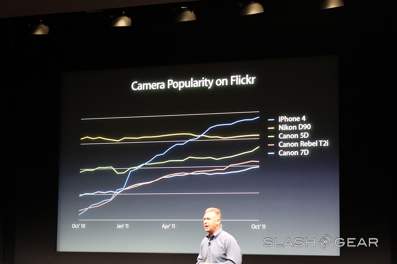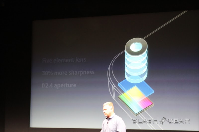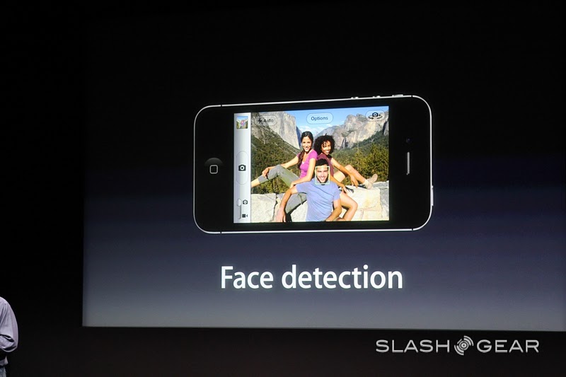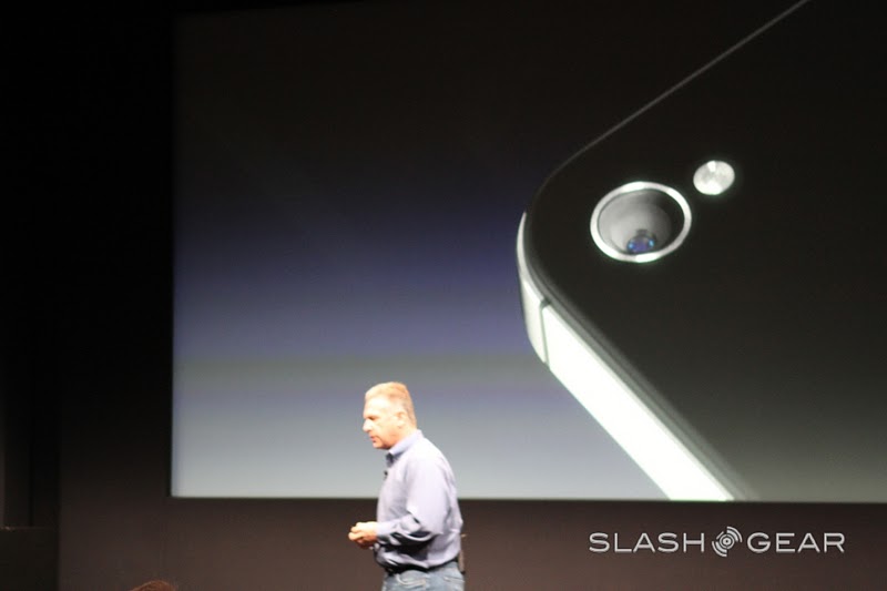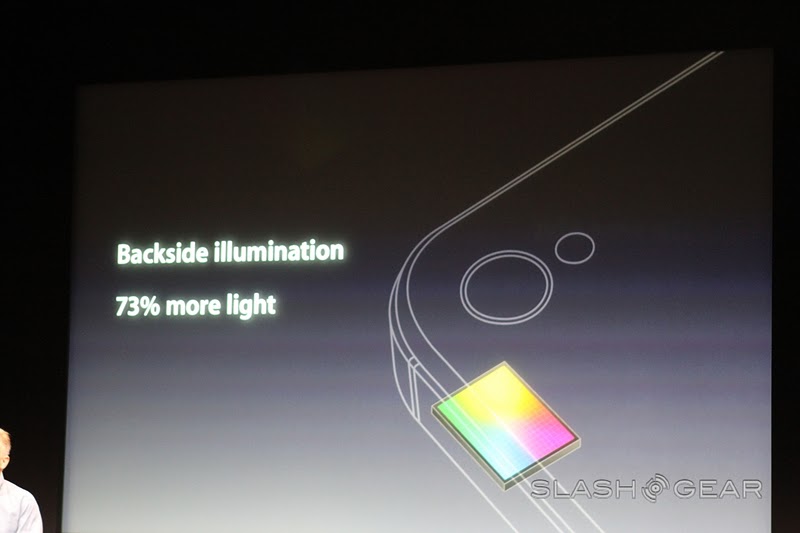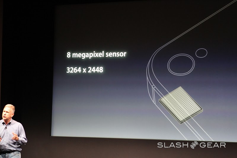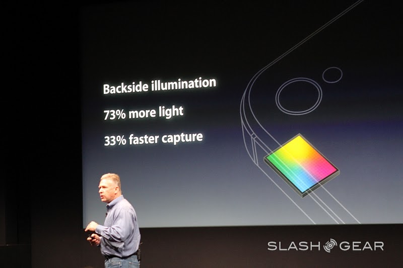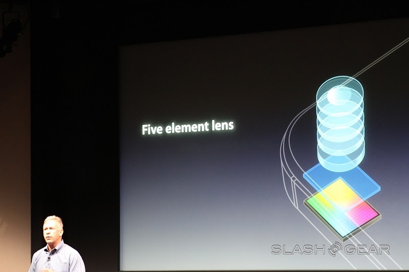 The new camera on the iPhone 4S is 8 megapixels strong and can shoot in 3264 x 2448 – "that's 60% more pixels than the iPhone 4." Yes it is, Phil, and with the new filter that's being introduced today, 73% more light can be captured than in previous models, and it's faster! Goodness, this seems like a rather cool improvement. There's a new Hybrid IR filter, better white balance, and face detection.