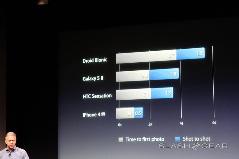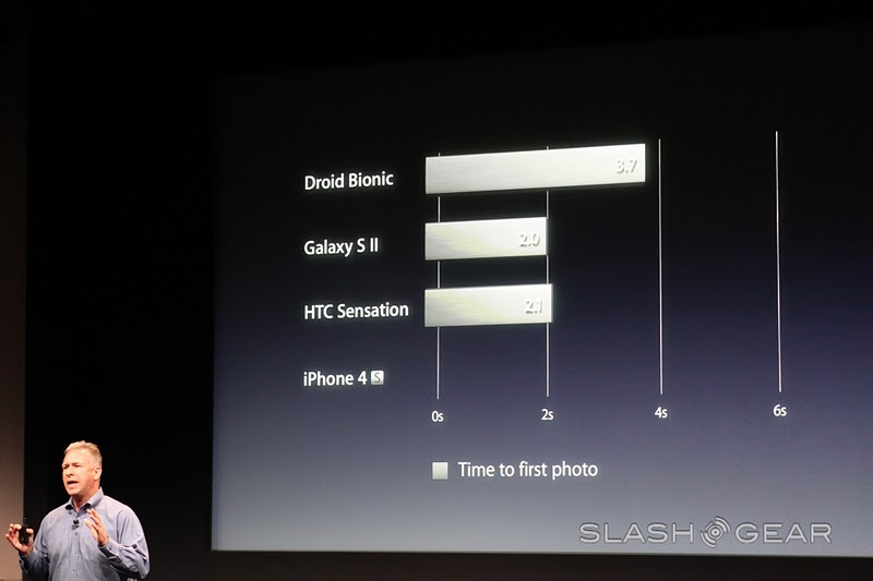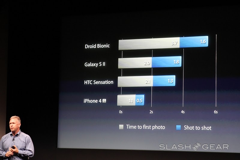 This new camera allows you to take a photo in 1.1 seconds, then just a half second more to take a second shot. Phil makes fun of the DROID BIONIC's supposedly terrible camera with a note: "I don't know what Droid Bionic customers have to do between taking pictures... like, go get coffee." And adds that the iPhone 4S camera will have 1080p HD video recording, video image stabilization, and temporal noise reduction. Winner!