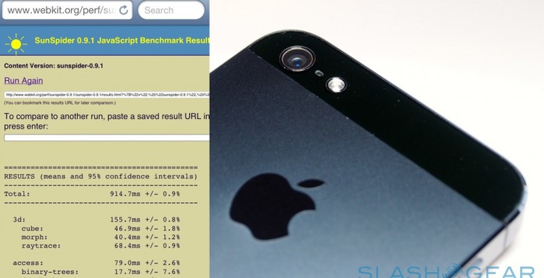Apple was pretty confident the iPhone 5 would outperform its predecessors overall with the new A6 chipset, and Sunspider benchmarks suggest the new iOS 6 smartphone now takes the top spot for mobile browsing. SlashGear ran the browser test as part of our full iPhone 5 review, and the Apple handset breaks a new record for phones in coming in under the 1,000ms mark.