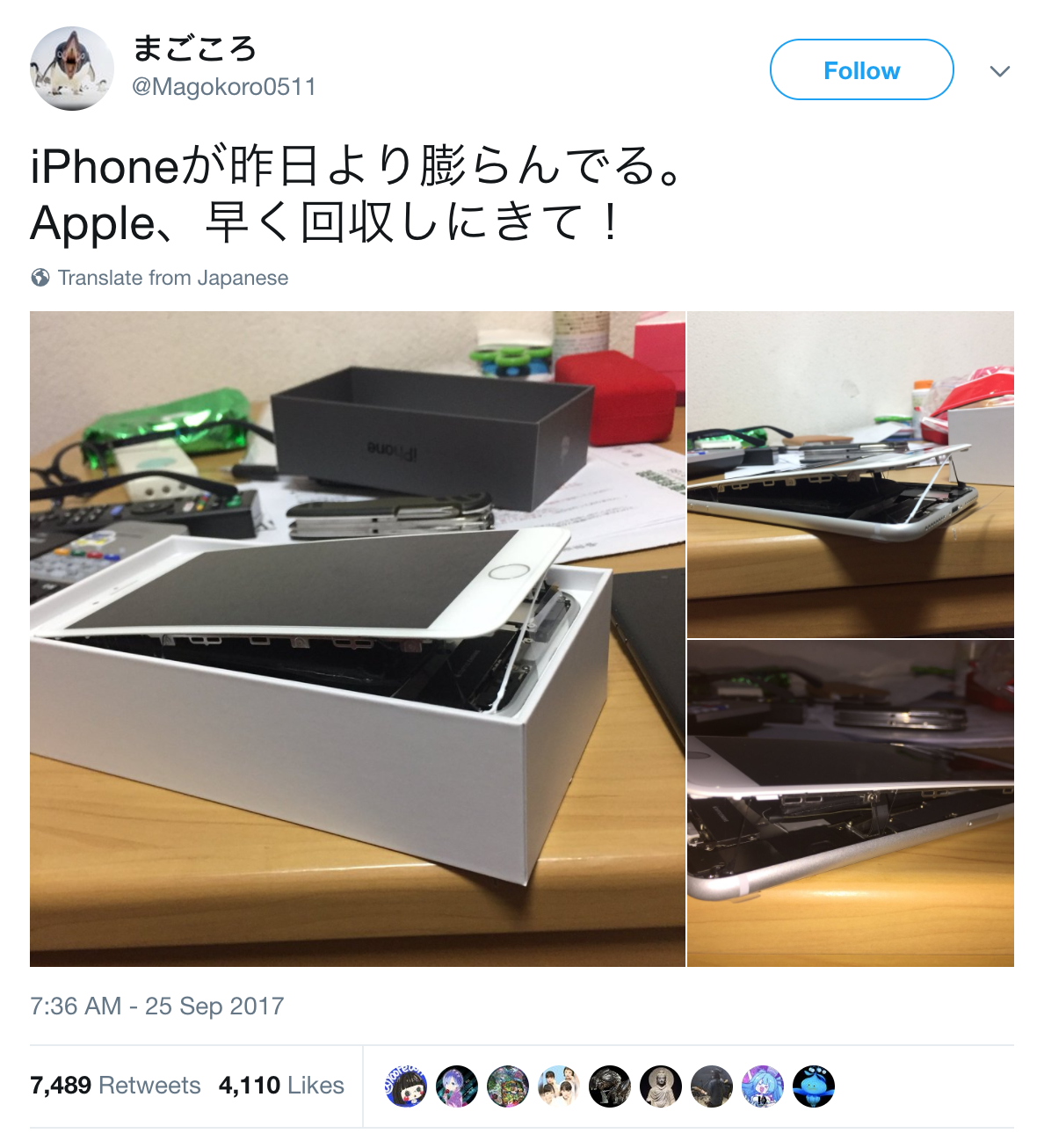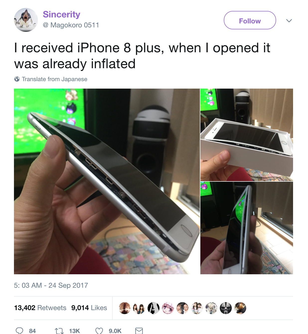 One of the two clearly differentiated devices comes from Japan. There, まごころ (Twitter user @Magokoro0511) suggests that his iPhone 8 Plus was "already swollen" when he opened the box. This would indicate that there'd more likely be a manufacturing issue than anything related to in-progress charging.