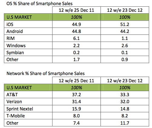 Apple's iOS clung to the top-spot for smartphone platform share in the US in Q4 2012, new research suggests, maintaining more than half of the market, though the gap between AT&T and Verizon sales has narrowed. iPhones made up 51.2-percent of the US smartphone sales, Kantar World Panel claims, while Android dropped a little to 44.2-percent, a fall of just 0.6-percent year-on-year.
