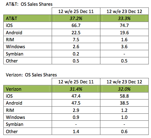 As for share by carrier, AT&T maintains the top-spot for smartphone sales, though only just, with 33.3-percent of the market. Verizon has closed the gap, however, being just 1.3 points behind. Together, the two carriers represent the lion's share of smartphone sales.