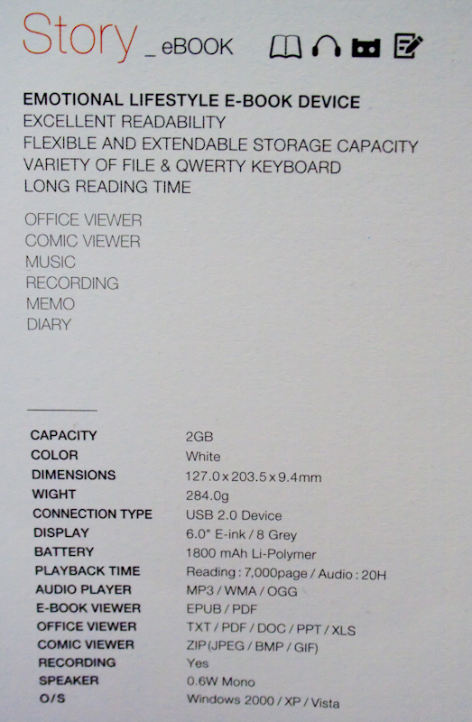 Connectivity qualms aside, the Story is a reasonably handsome – if not exactly boat-rocking – device, with a full QWERTY keyboard, 0.6W mono speaker and 3.5mm headphone jack. The 1,800mAh battery is good for up to 7,000 page-turns or 20 hours of audio playback, and the whole thing measures 127 x 203.5 x 9.4 mm and weighs 284g (a little narrower, little thicker and a little lighter than the Kindle 2).