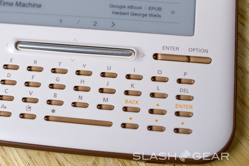 There's no headphone jack or speakers of any sort, meaning audio books are out of its scope. The only other items embellishing the exterior, then, are the power on/off slider, a covered SD card slot, and a mini USB 2.0 port. Inside, it has 2GB storage instead of the Kindle's 4GB, but is expandable with SD cards up to 32GB. It connects via USB for charging and for transferring files to and from your computer. It can also connect to your wireless network via Wi-Fi, but only to access Google's eBookstore.