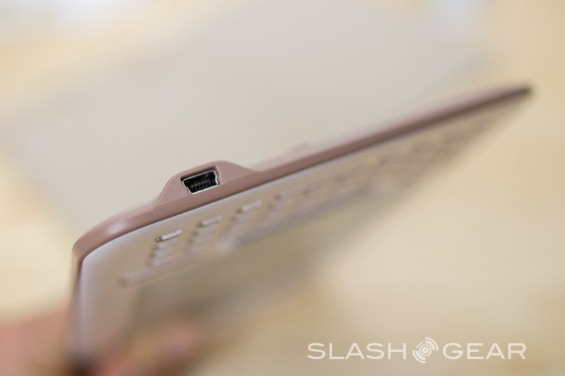 The design of the iRiver Story HD is a bit surprising at first glance. Chocolate milk brown is an unusual color choice, but that's what covers the back and the framing edge while the front face is a creamy white. The keyboard is comprised of horizontal slivers of raised buttons resembling clear glass beads with brown backing underneath while the four-way controller button is silver.