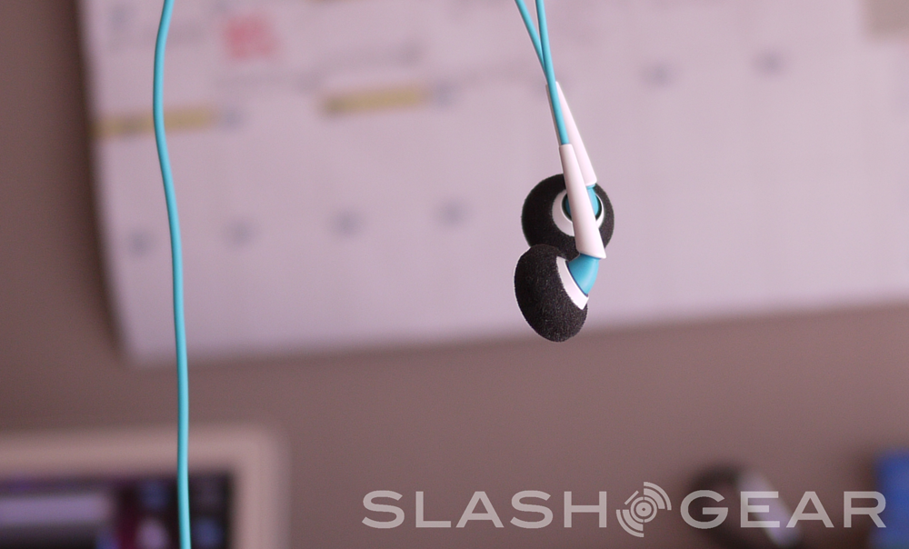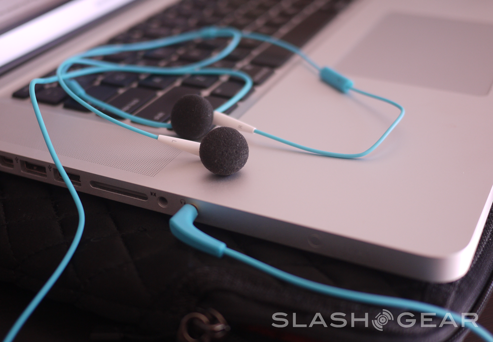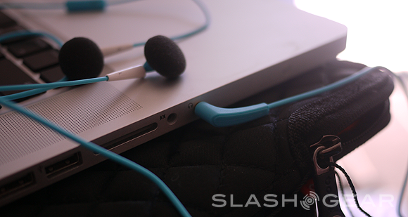 This set of buds also works with an inline remote that allows you to control the music player you're using on your device and to receive and make phonicalls if you're using an iOS or BlackBerry powered handset. This track flipper also conveniently works with Android and Mac OSX devices such as the MacBook Pro (Spring 2011 edition) pictured above and below. The earbuds also feature what they're calling FlexFit necks for the comfort of your ears.