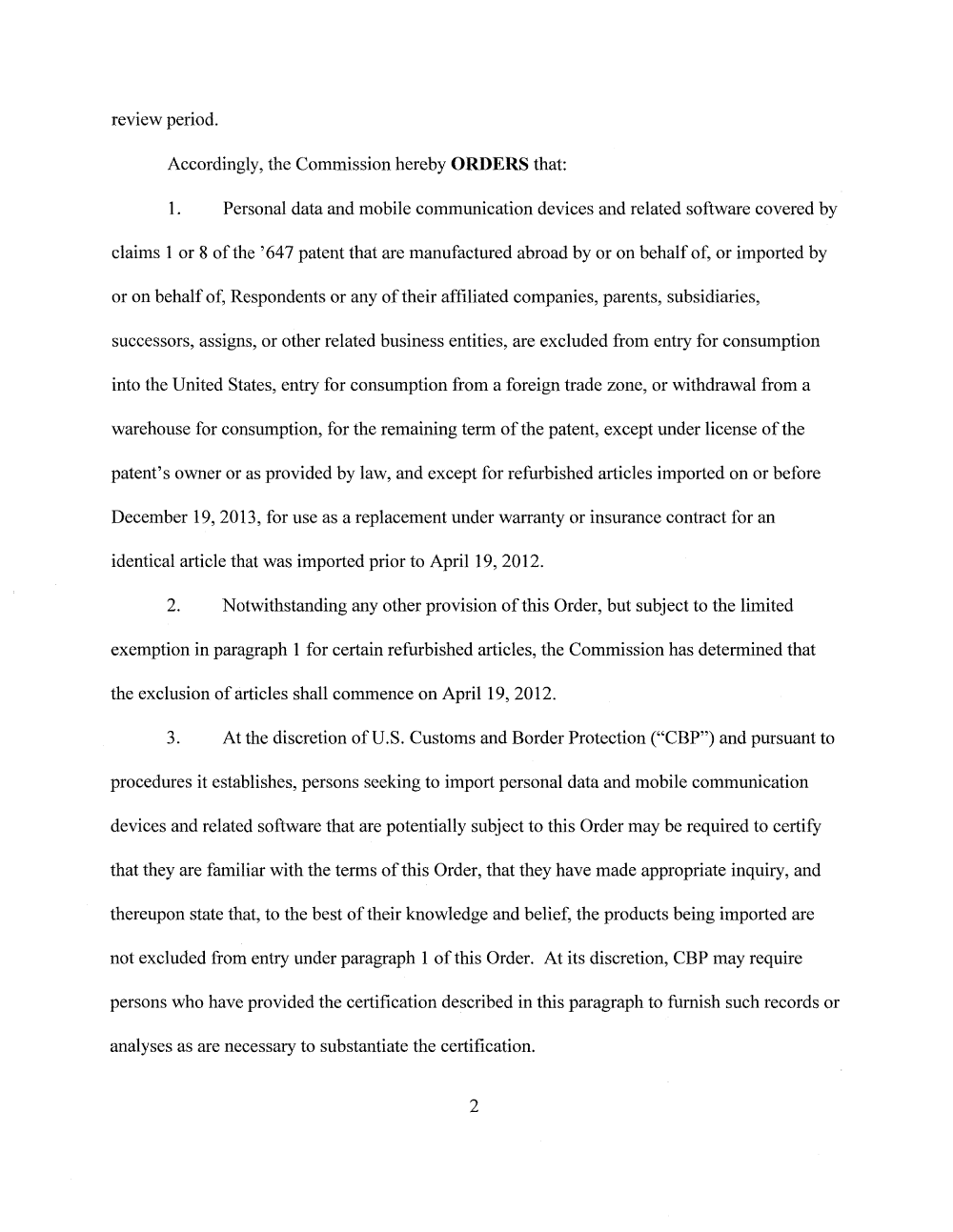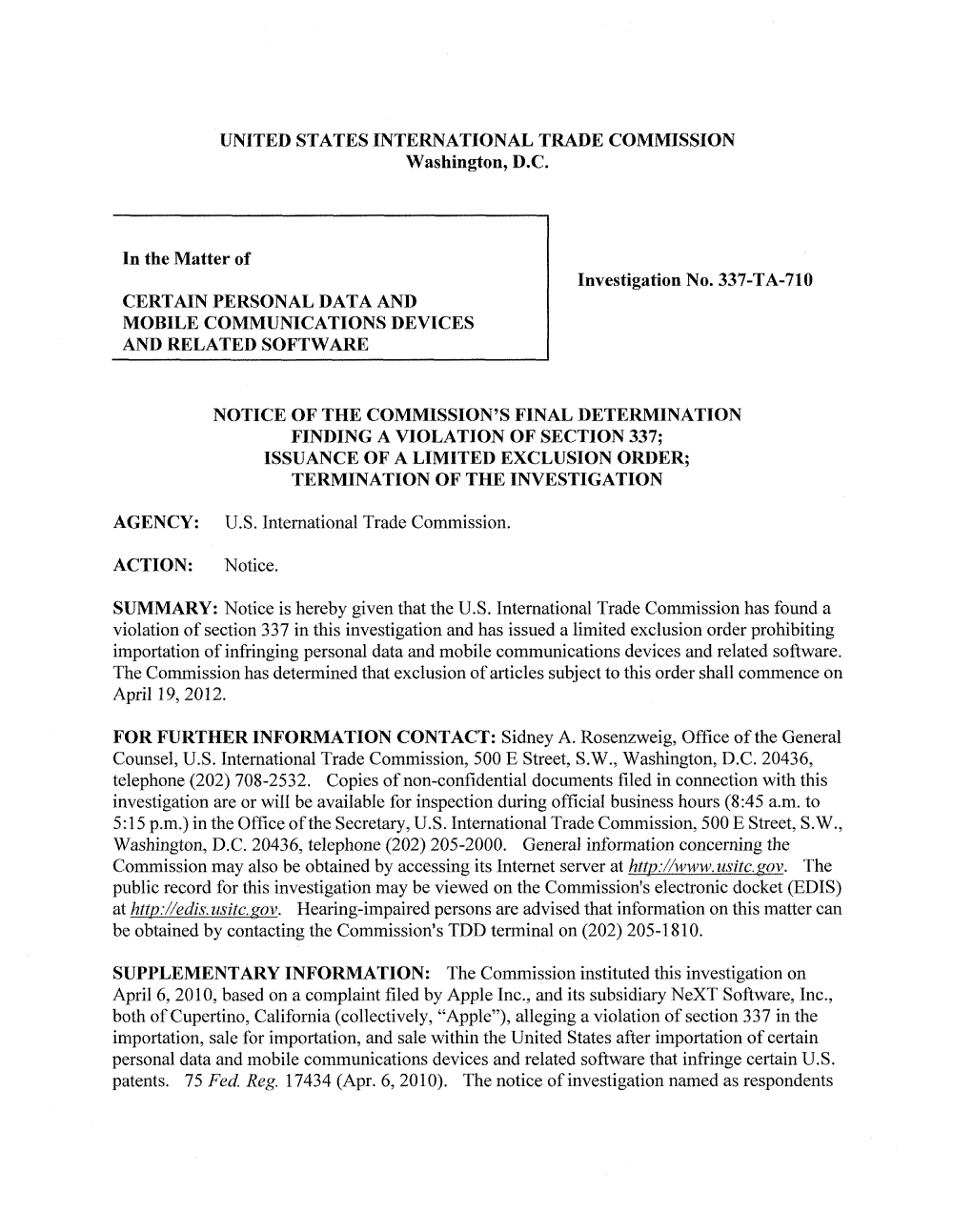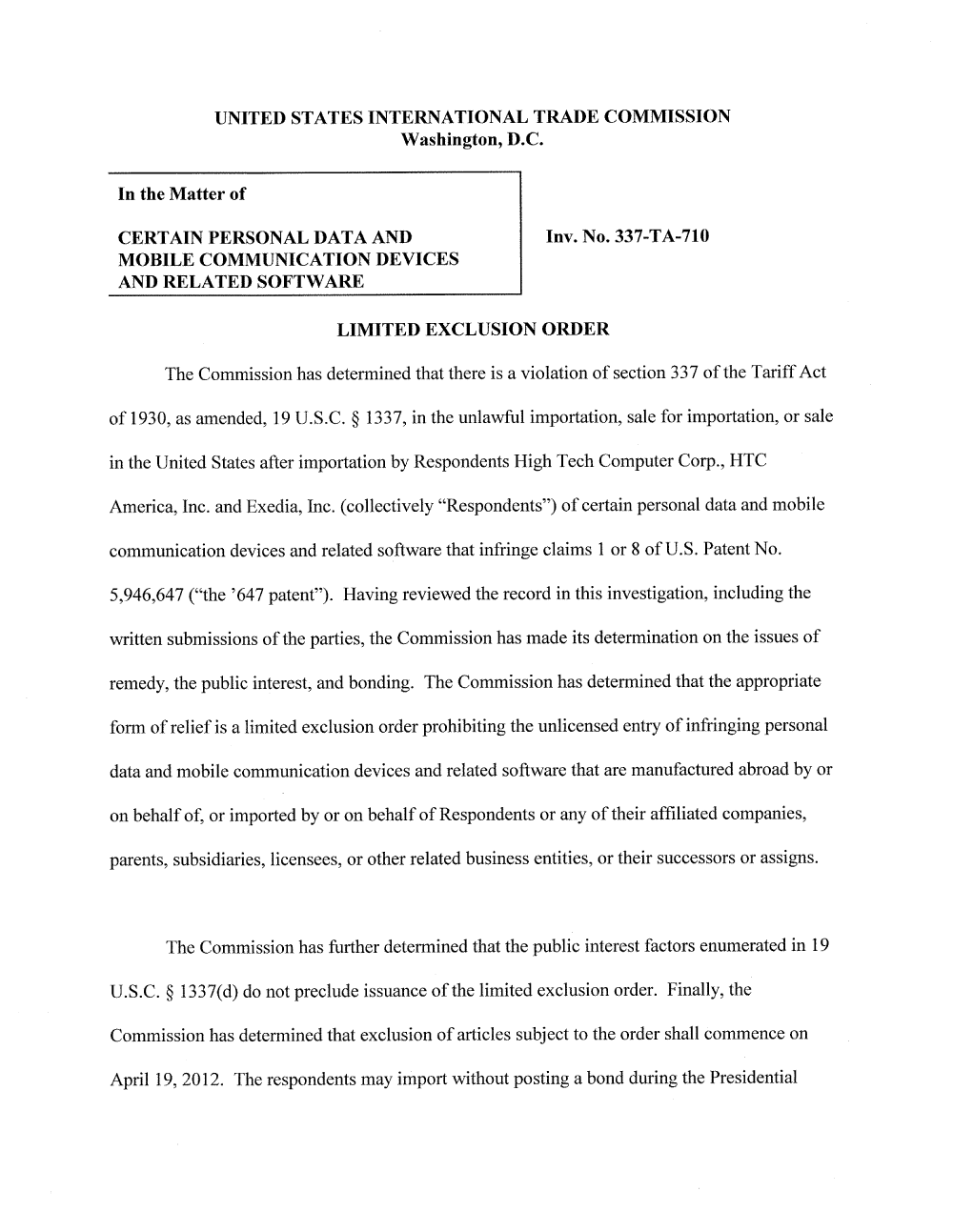 "Notice is hereby given that the U.S. International Trade Commission has found a violation of section 337 in this investigation and has issued a limited exclusion order prohibiting importation of infringing personal data and mobile communications devices and related software. The Commission has determined that exclusion of articles subject to this order shall commence on April 19, 2012."
