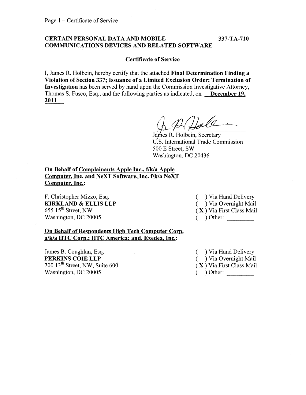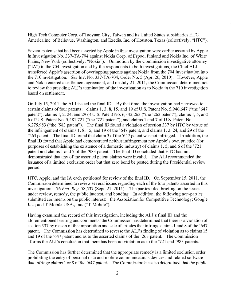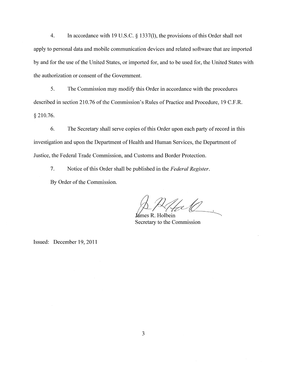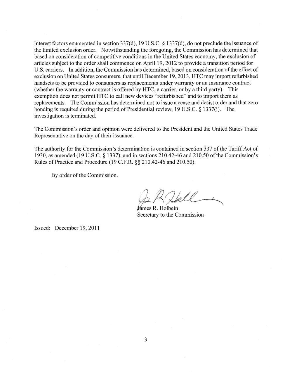 "Notice is hereby given that the U.S. International Trade Commission has found a violation of section 337 in this investigation and has issued a limited exclusion order prohibiting importation of infringing personal data and mobile communications devices and related software. The Commission has determined that exclusion of articles subject to this order shall commence on April 19, 2012."