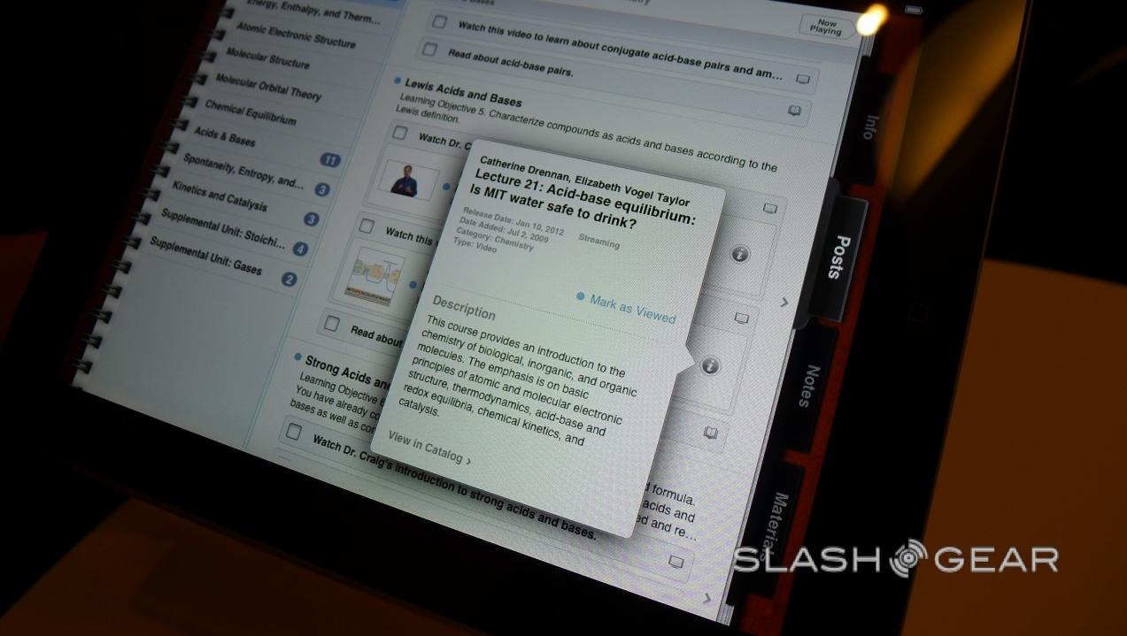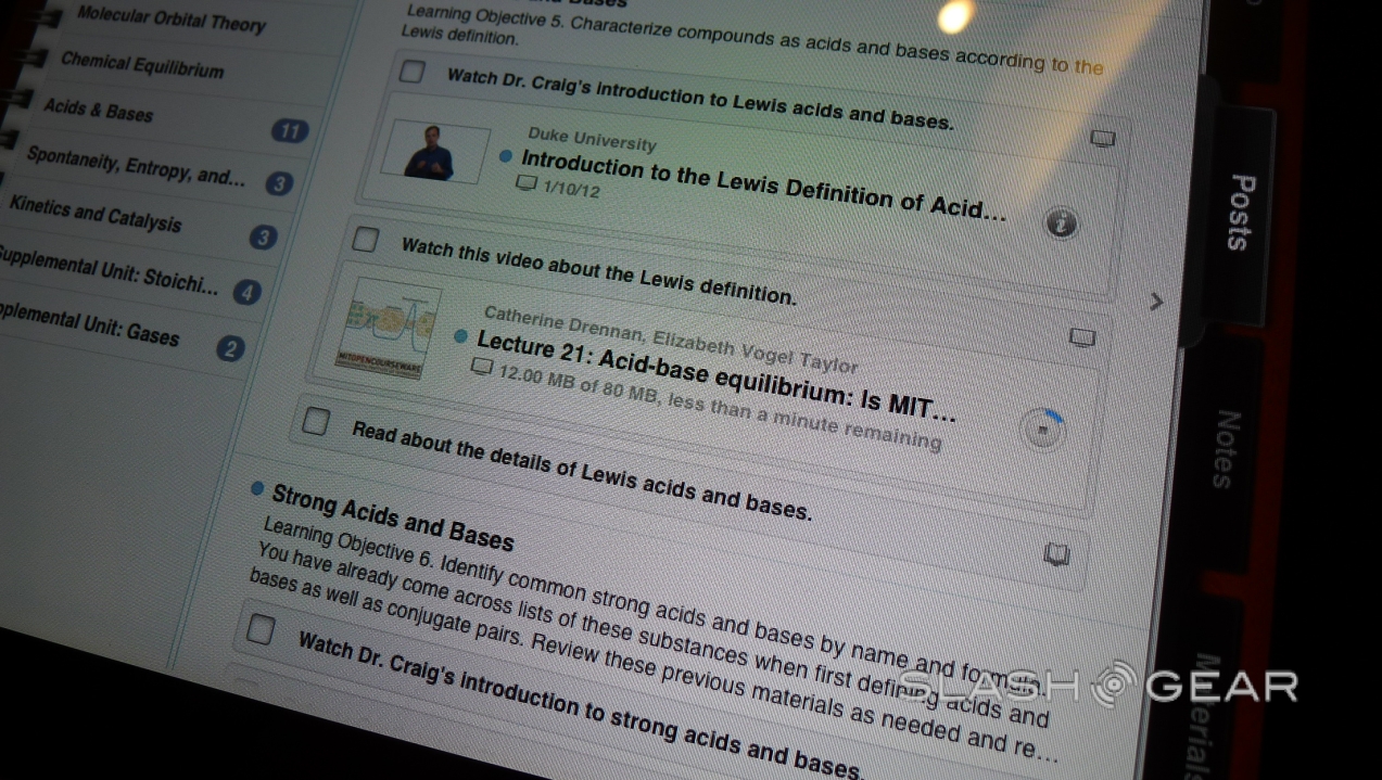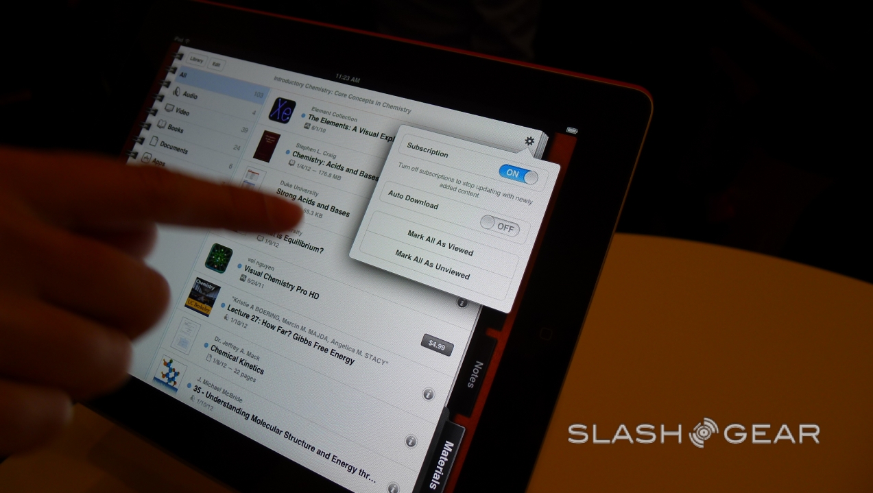 As you might expect, everything is tightly interlinked. Video content required for a certain lesson takes you not just to the clip itself, but the exact point referenced. That also gives Apple an opportunity to leverage the free iTunes U content into making schools and universities – along with itself – some money, linking purchases of apps and other textbooks in with one-click ease. All notes taken get pulled into the central iTunes U "My Notes" section, and clipping out portions – as well as changing color and the like – is tap-and-drag simple. iCloud is used to sync bookmarks and notes across multiple devices.