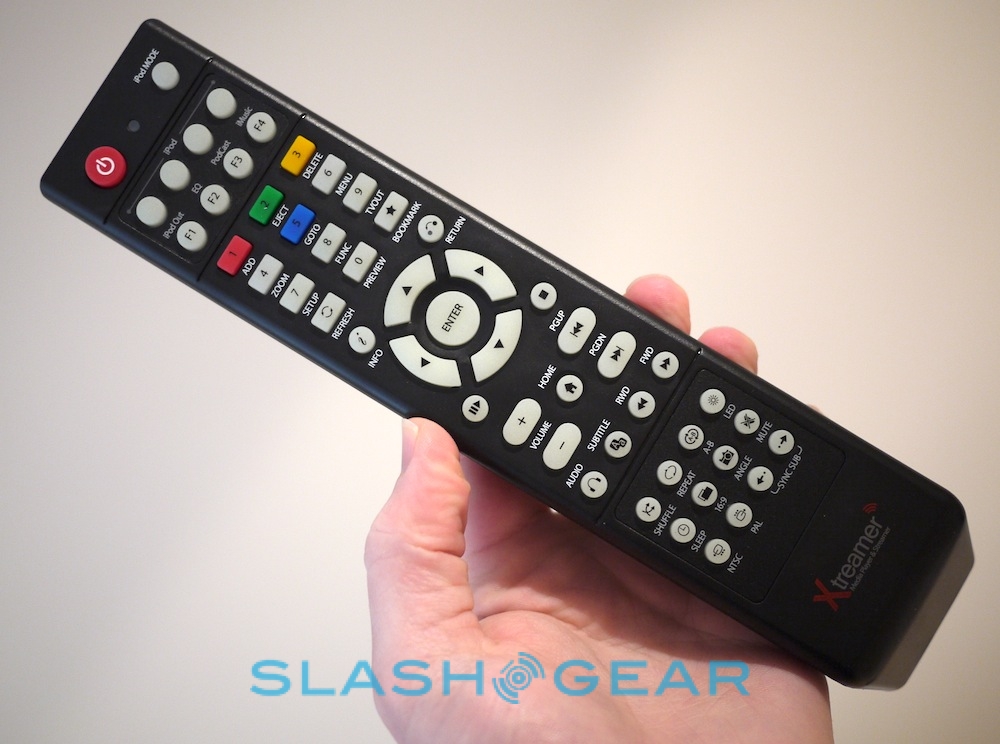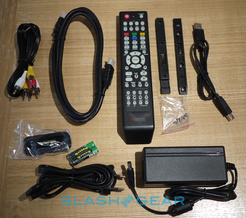 As well as the iXtreamer, there's an HDMI cable, composite video cable (though not component), the drive mounting kit, iPhone dock adapter, a USB cable for mounting the iXtreamer as an external drive, and the PSU (which came with a European power cord, despite this being a UK unit). There's also a comprehensive remote (including batteries) which is a big improvement over the tiny credit-card sized zappers most iPod docks get. It's not exactly handsome but it's full-featured, and the buttons glow in the dark; you can even use it to turn off the LED indicator light on the iXtreamer itself.