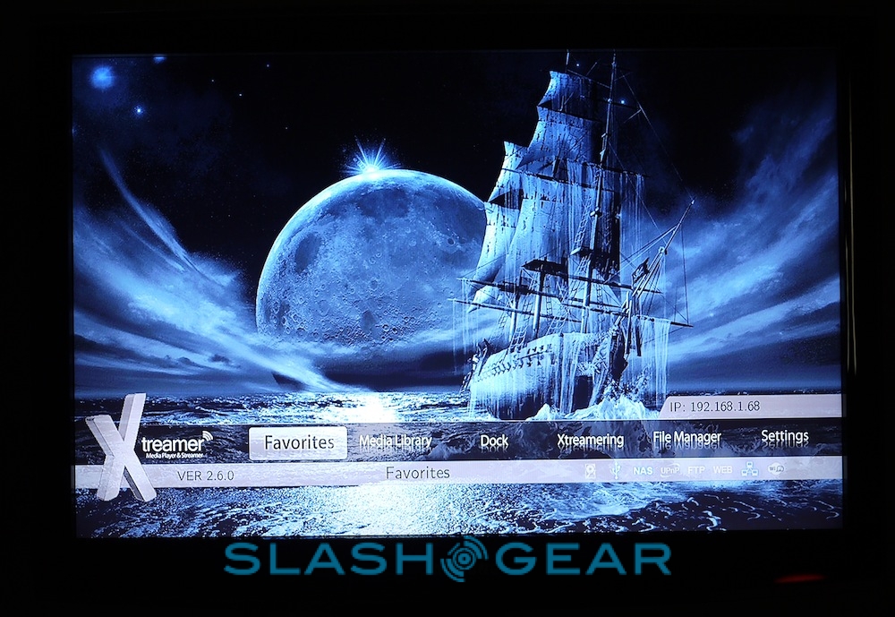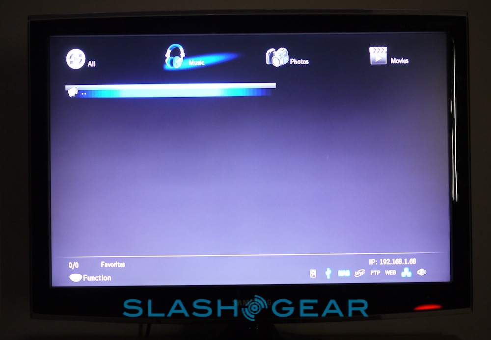 The basic homescreen has six options, Favorites, Media Library, Dock, Xtreamering, File Manager and Settings. Along the bottom of the display, the IP address (assuming you have a network connection) and status icons are shown, illuminating when there are USB drives attached, network shares, an internal HDD, network connectivity and other system elements. The settings page is comprehensive, though all we needed to tweak initially was the output resolution (which sensibly defaults to the 480p lowest common denominator) to suit our TV. However, there are options for subtitles (with user-assignable fonts), slideshow transitions, aspect ratio, brightness/contrast/hue/saturation, Dynamic Noise Reduction and more, including a choice of DTS/Dolby TrueHD/Dolby D+ audio, DTS/Dolby D 2.1CH audio, or AAC/FLAC/OGG 5.1CH audio. You can also toggle on or off the NAS, UPnP streaming, web server and FTP server functionality.