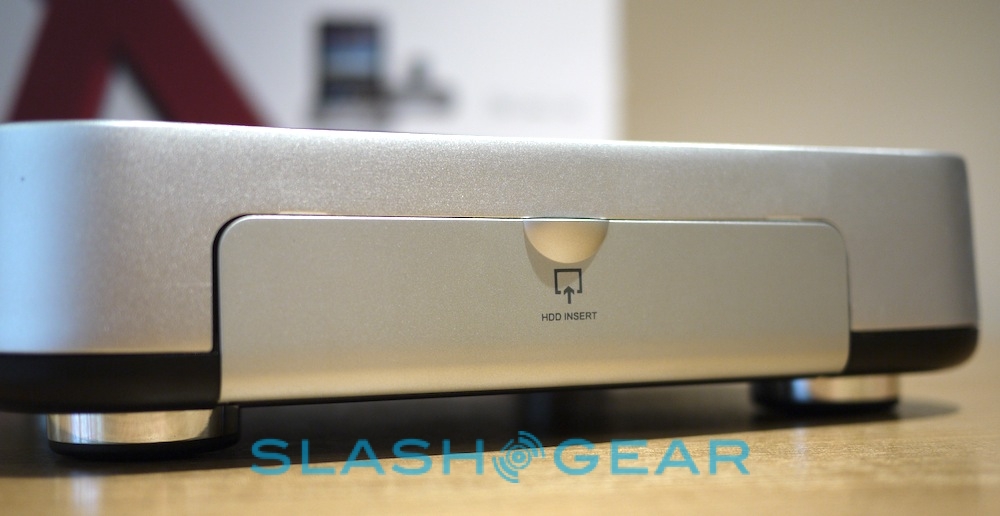 On the right side is a door hiding the 3.5-inch SATA drive bay (and the only less-than-solid part of the unit's construction); some iXtreamer SKUs include a preloaded drive, but the basic model comes empty for you to fit your own. A pair of drive rails and the necessary screws are supplied, and up to 3TB HDDs are supported (with the current latest firmware, v2.6.0). It's worth noting that you don't actually need an internal HDD in place in order to use the iXtreamer; you can also stream content across a network instead.