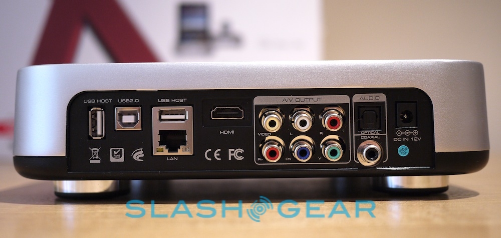That's courtesy of the 10/100 ethernet port, which shares a crowded rear panel with two USB 2.0 Host ports, a single USB 2.0 Device port (for hooking up the iXtreamer to a computer and accessing its internal drive), HDMI, composite and component audio/video, and optical/coaxial digital audio outputs. No integrated wireless, but Xtreamer does offer a USB WiFi b/g/n adapter separately.