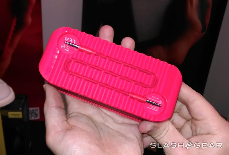 Battery life is pegged at up to 8 hours, and both Bluetooth and NFC are on board for wireless pairing with a variety of devices. As you can see in the image below, the sole of the speaker has an integrated cable for those times one might need a wired connection. The Jabra Sound App 2.0 has also been introduced, adding YouTube streaming and Dolby Digital Plus into the mix.