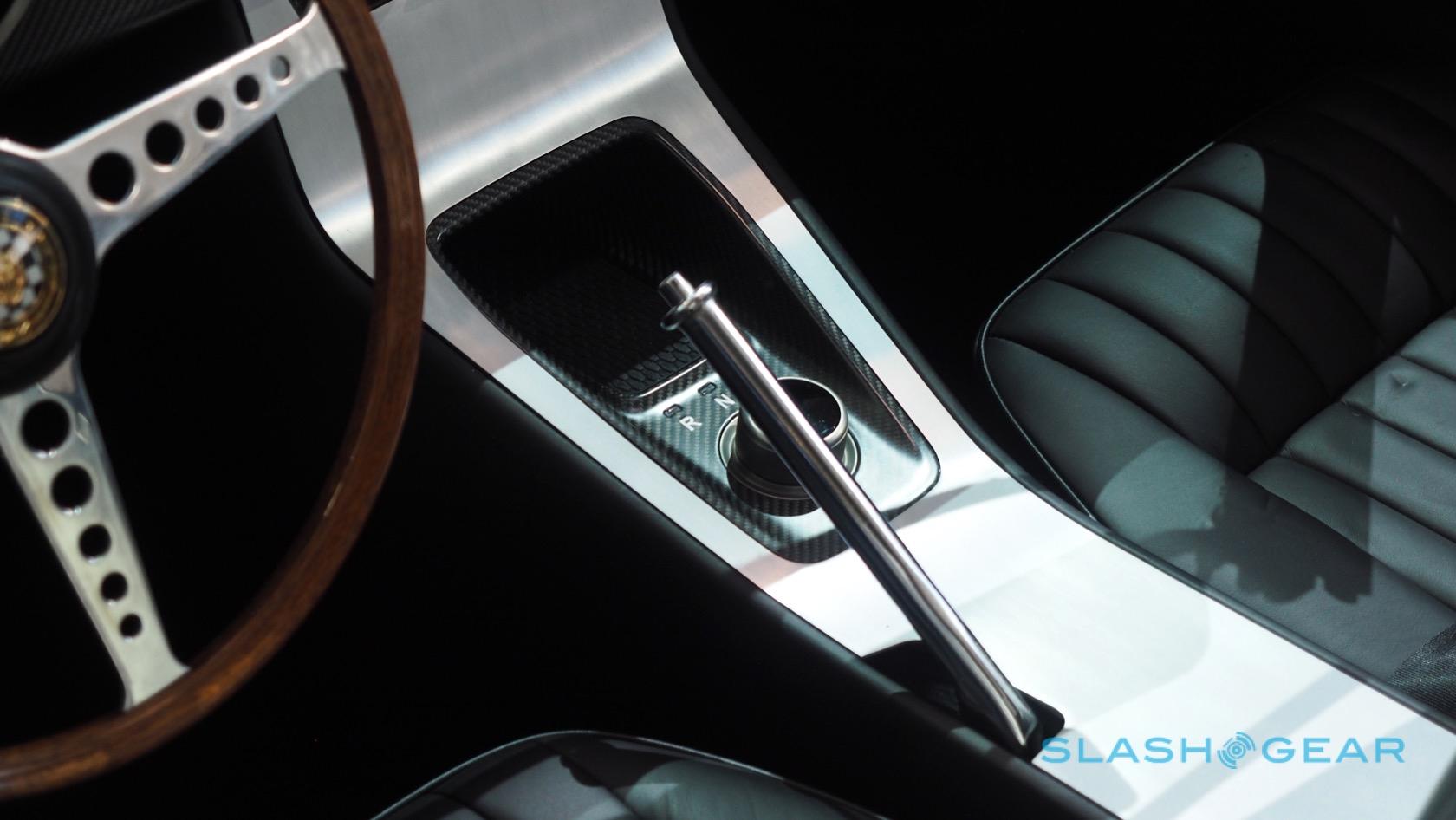 In the center console, there's the rotary controller from modern Jaguars, a little incongruous alongside the slender chromed stem of the original parking brake handle. A bank of toggle switches is reminiscent of the controls found in the E-Type's modern-day equivalent, the Jaguar F-TYPE. It's underneath a touchscreen which gives access to the thoroughly modern infotainment system.