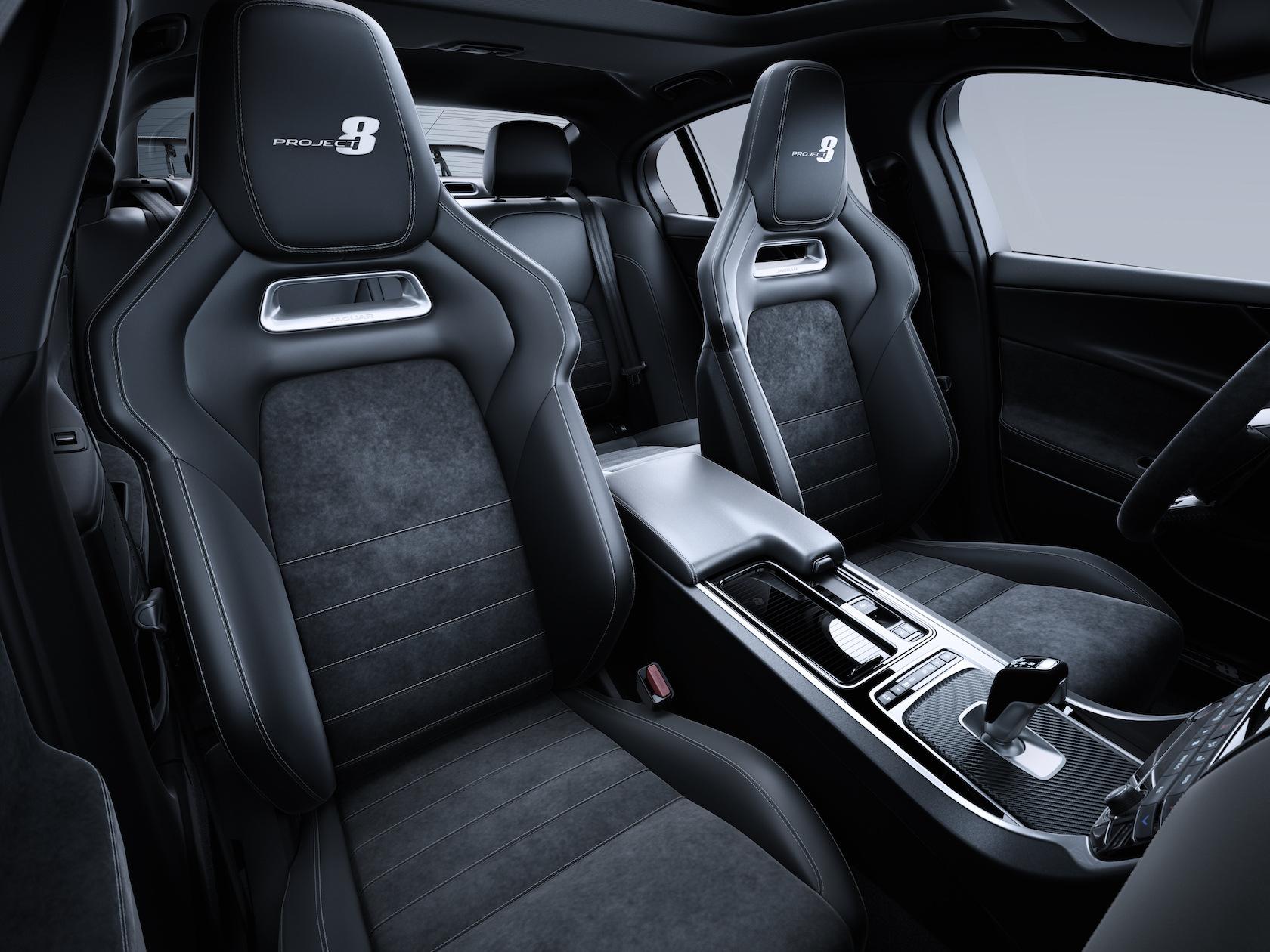 Inside, the standard interior has two magnesium-frame performance front seats with contrast-stitched bolsters and Project 8 logos. The rear now accommodates two, not the three of the regular XE, thanks to the addition of extra lateral support. Black, reflection-killing Alcantara covers the dashboard and instrumentation, along with the door panels and steering wheel; it contrasts with gloss carbon fiber detailing.