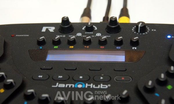 It's a half moon device that has a little LCD and a bunch of knobs and buttons. Around the half-moon is seven different inputs and outputs for headphones. The idea is that you can plug your instruments into the Jam Hub and then listen to the session on headphones. The only thing I see issue with is the drums (unless electric) will still drive the neighbors crazy.