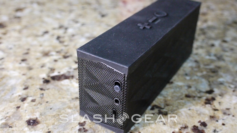 The JAMBOX manages to be both reasonably minimalistic and distinctive in its design, a sturdy, blunt-edged block available in blue, black, red or grey. The top and bottom sections are molded rubber, which stops the speaker from sliding around a desk but does tend to pick up dust and fluff quite readily, while the remaining four sides are clad in a single, folded sheet of mesh with a pressed diamond pattern. Jawbone says their push for using single components rather than multiple sections means there are fewer parts to vibrate and a more durable device; we certainly couldn't hear any buzzing from the JAMBOX's chassis, and we feel pretty confident it could survive a fair few journeys dropped into a rucksack.