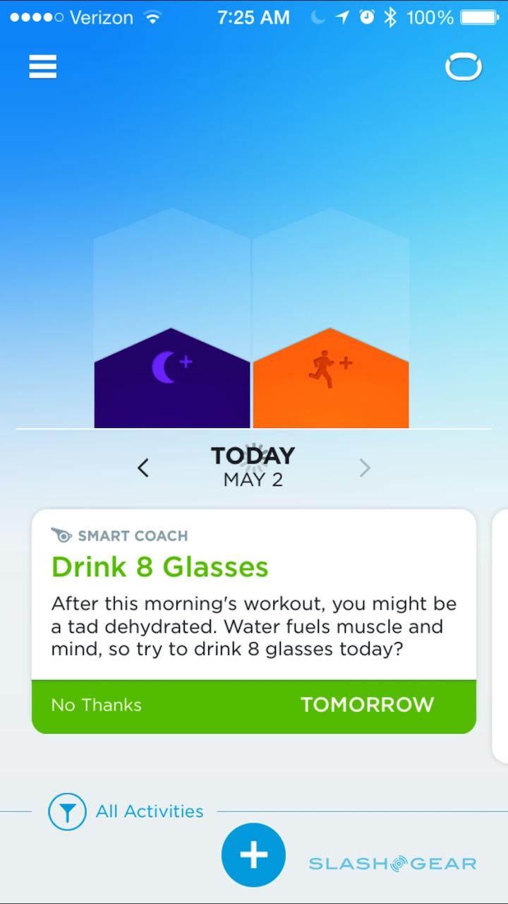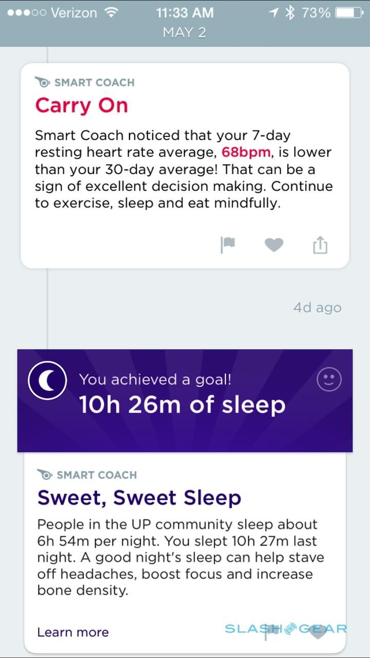 Meanwhile, the Smart Coach begins to try to coax you into a healthier lifestyle. If you're short on steps compared to your typical day, the UP app will pop up a suggestion to get moving; if your bedtime has been irregular, it'll prompt you to get your head down at a more sensible time.