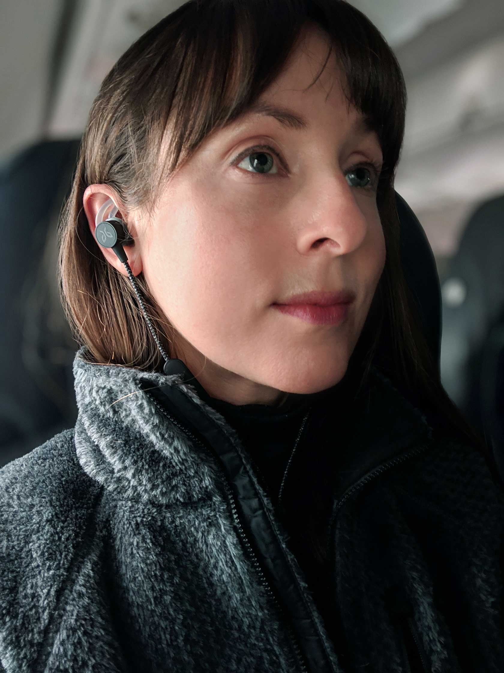 Worn as under-ear/casual-fit, the headphones are great for making calls or travel. Little ambient noise is audible: you can barely hear a plane's engines, let alone the guy talking in the seat next to you. While it's possible to phone your friends and family with the microphone behind your neck, they definitely appreciated better call clarity with the microphone positioned forward and under the chin.