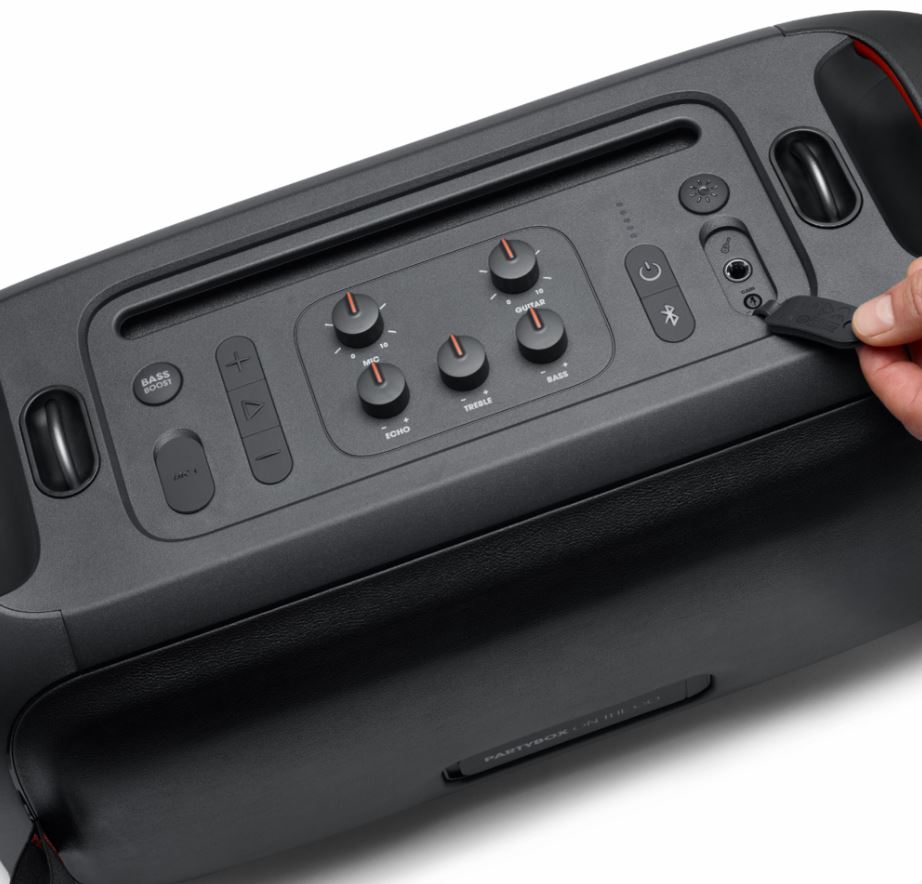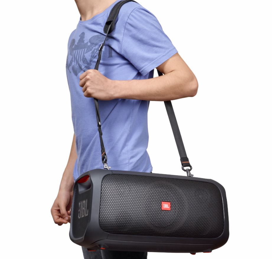 Next up we have the PartyBox On-The-Go, which is so big it needs a shoulder strap for portability. This is a speaker for the karaoke fans of the world, as it ships with a wireless mic that has bass, treble, and echo tuning. The speaker itself boasts a 100W output; supports Bluetooth, USB, and AUX connections; and also puts on a light show which is synced to the music that's playing. It even has physical mic and guitar inputs, so you can use it as an amp if you need to.