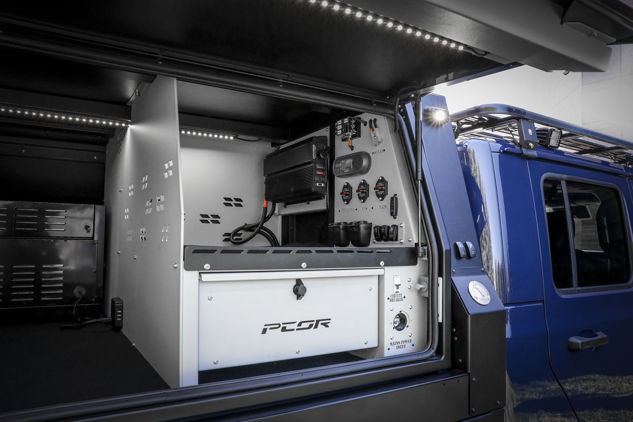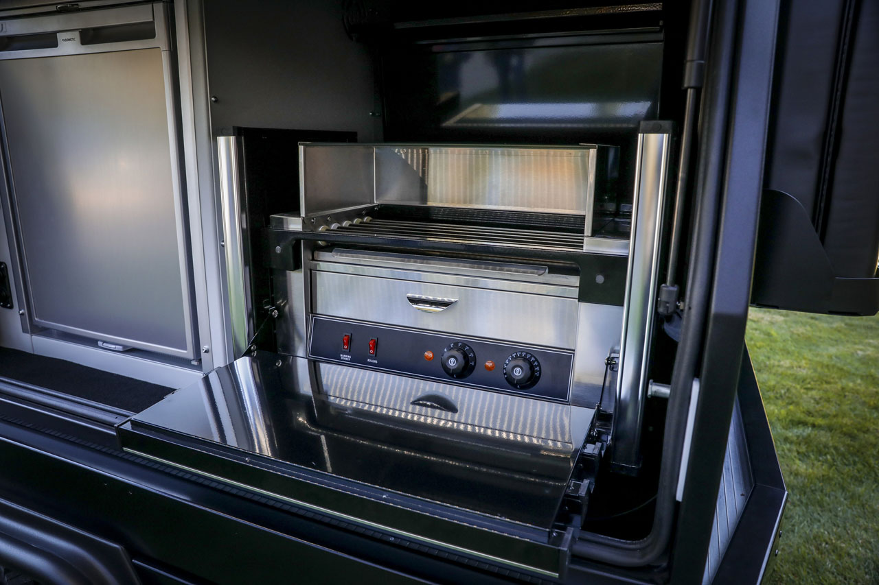 A large amount of interior storage shelf space and exterior lighting switches along with power supplies are within reach. The system's driver side has a battery-powered refrigerator and electric hot dog roller grill stand to feed hungry riders out on the trails. Above the cab are a pair of rack structures that provide additional storage for tools and equipment.