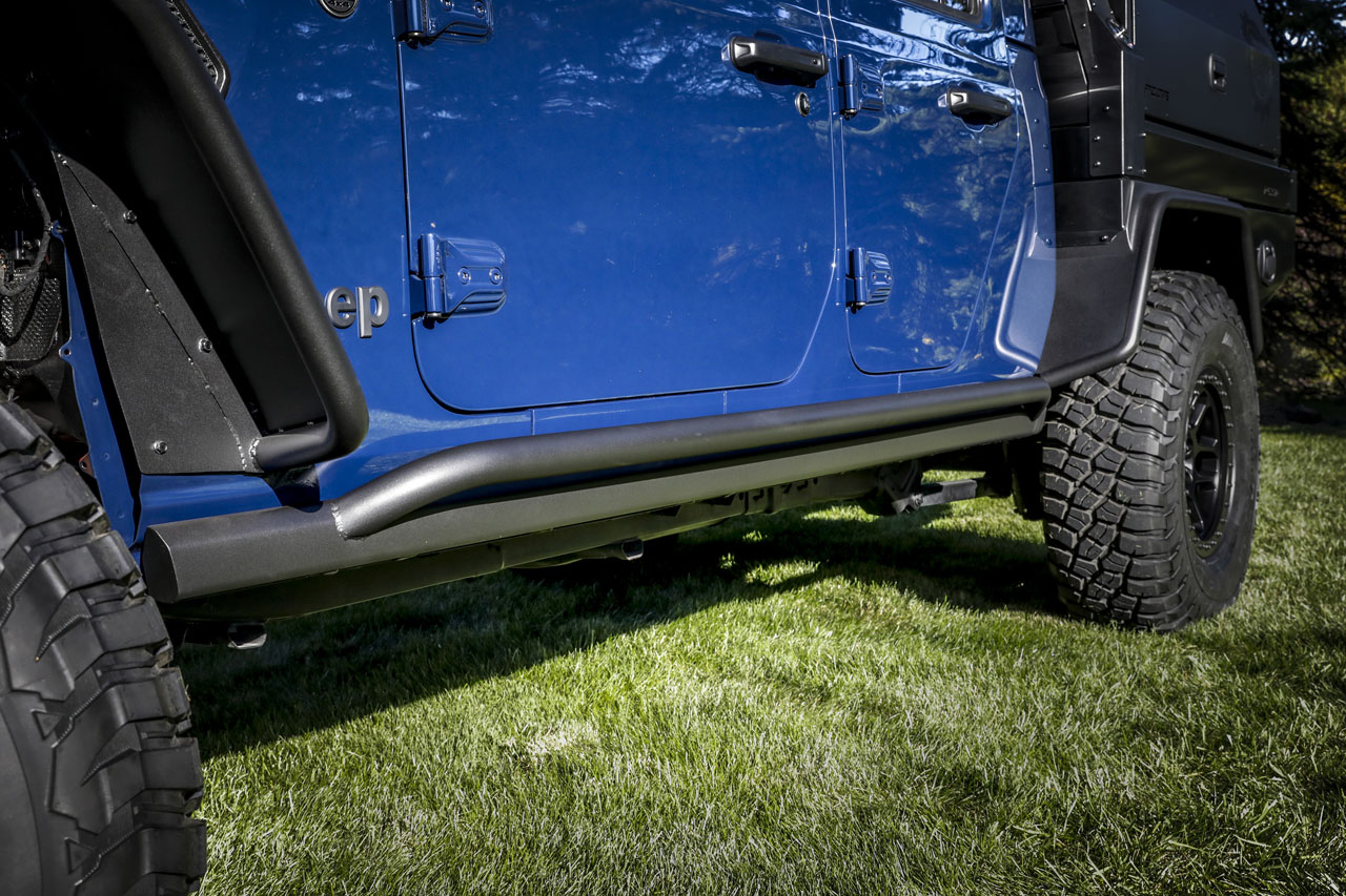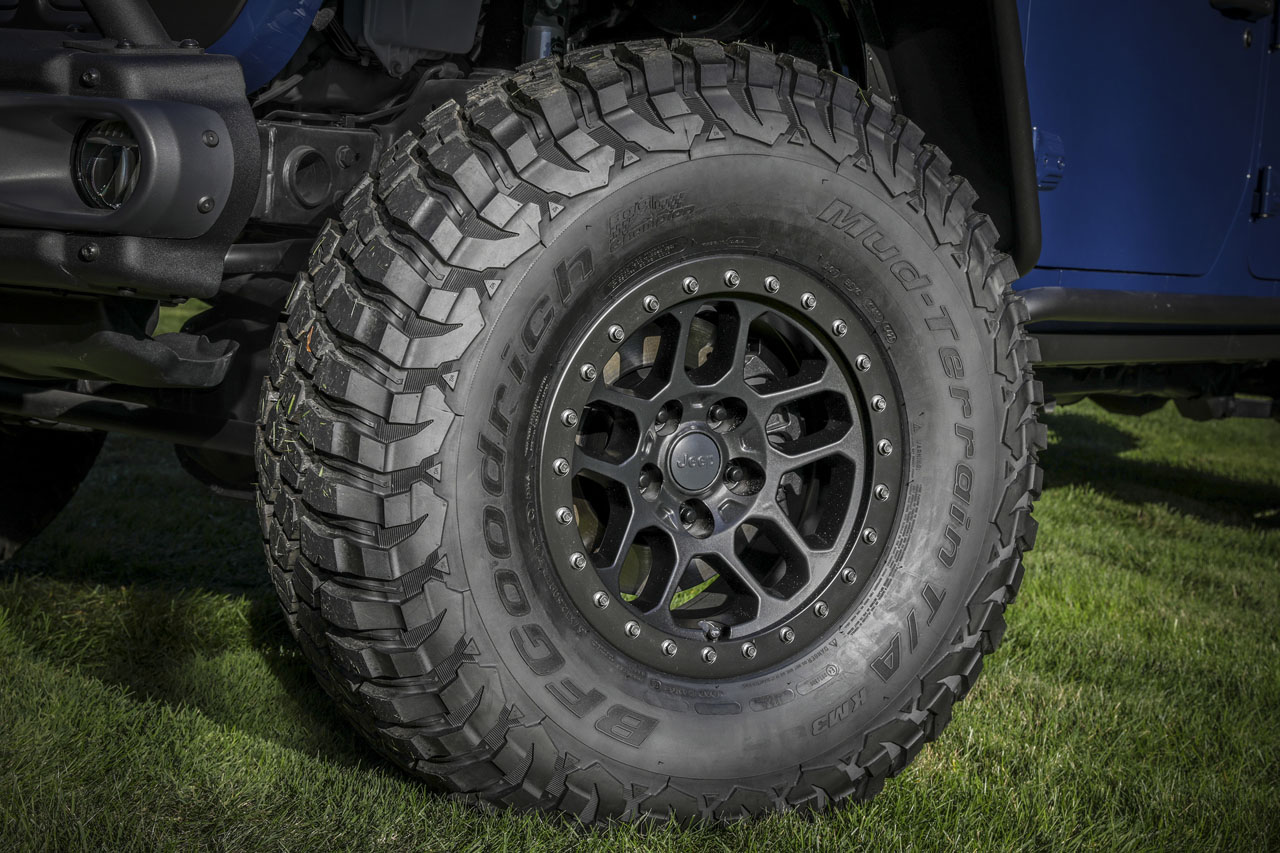 The vehicle rolls on a JPP 2-inch lift with FOX shocks and 17-inch JPP beadlock-capable aluminum wheels. The wheels are shod with 37-inch BFGoodrich KM3 mud-terrain tires. Steel fender flares give the tires extra clearance around the vehicle. Power comes from a standard 3.6-liter V6 making 285 horsepower and 260 pound-foot of torque with an eight-speed automatic. The vehicle also has a winch and Rubicon bumper upfront and numerous protection features, including rock rails and skid plates.