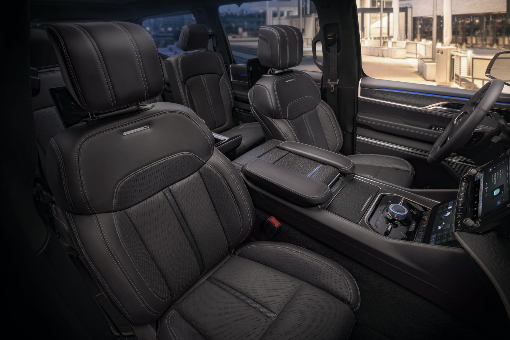 On the tech side, Jeep is fully onboard with the "make the displays huge" bandwagon. There's a 12.3-inch driver display behind the wheel, a 12.1-inch horizontal infotainment touchscreen in the center console, a 10.25-inch horizontal touchscreen for comfort controls below that, and then another 10.25-inch touchscreen for the passenger. In the second row, there are two 10.1-inch entertainment touchscreens and a 10.25-inch comfort display in the center console.