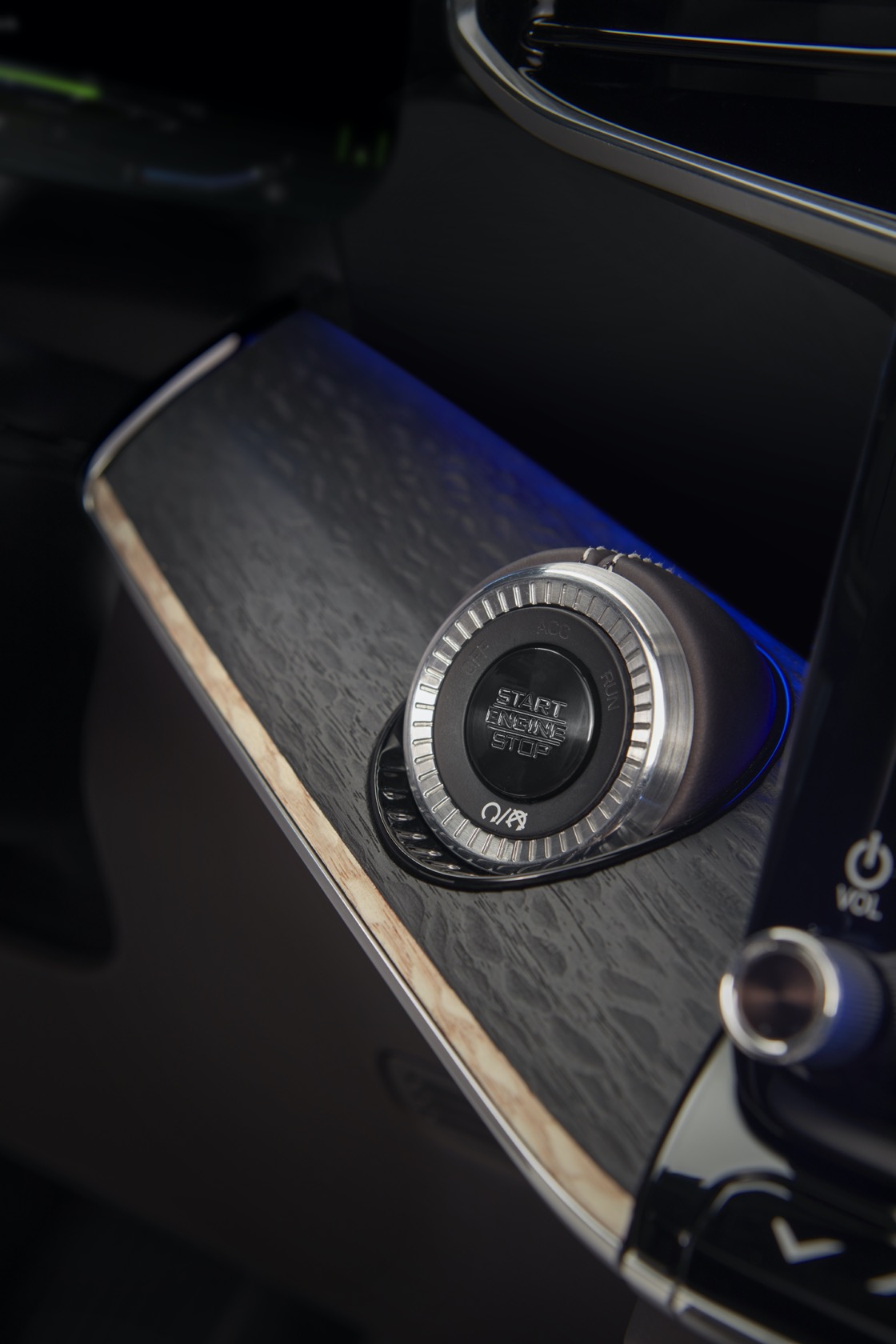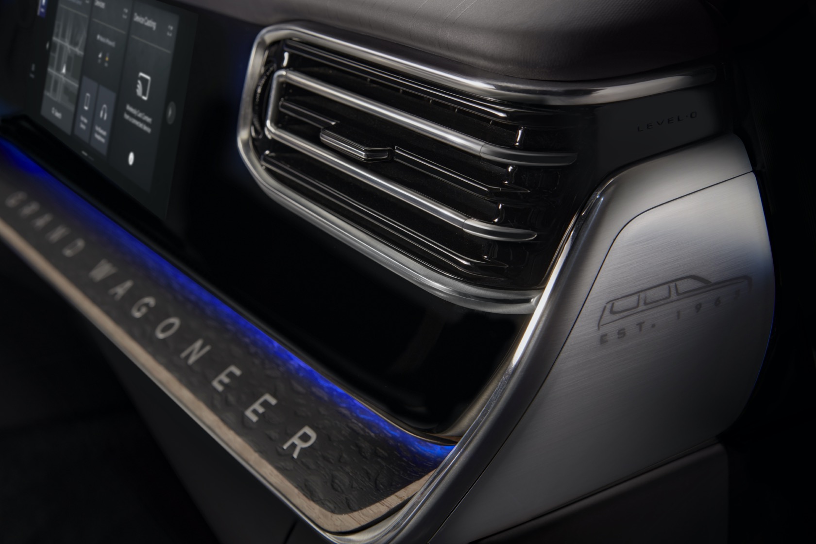 You might not hear it, but you'll certainly see it. It's a big SUV, with an Arctic Ice paint job and bold Wagoneer badging in a custom font. The grille is finished in Obsidian Black with latticework in the seven slats; LED lighting runs in-between those slots as well as outlining the grille itself. Twin bi-function LED projector headlamps get teak wood trim.