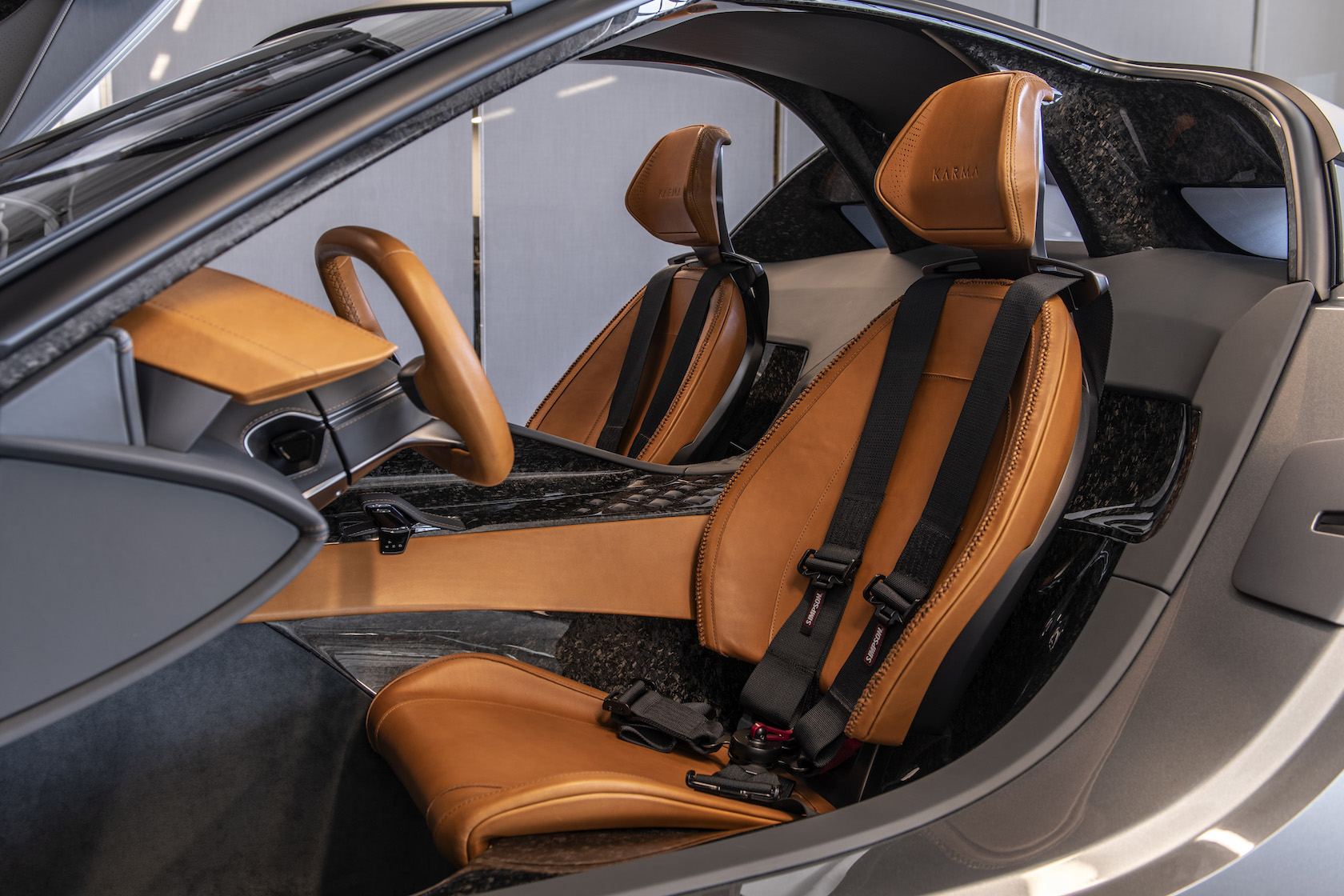 Inside, there's a fiber optic headliner, and a whole lot of technology. Fingerprint and facial recognition security is used to access the car, and then biometric seats and steering wheel promise the perfect fit. 3D audio can deliver different sound to the driver and the passenger, Karma claims, while the glass is electrochroamatic so as to adjust automatically from clear to opaque.