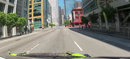 You'll find that this 650 horsepower vehicle that Block drives is more than ready to cruise at unheard-of speeds through the city streets in a collection of ways only otherwise possible in a video game. You've got GoPro cameras mounted in the car and on the car, stationary cameras at hundreds of locations along the roadway, and a helicopter cam as well, of course.