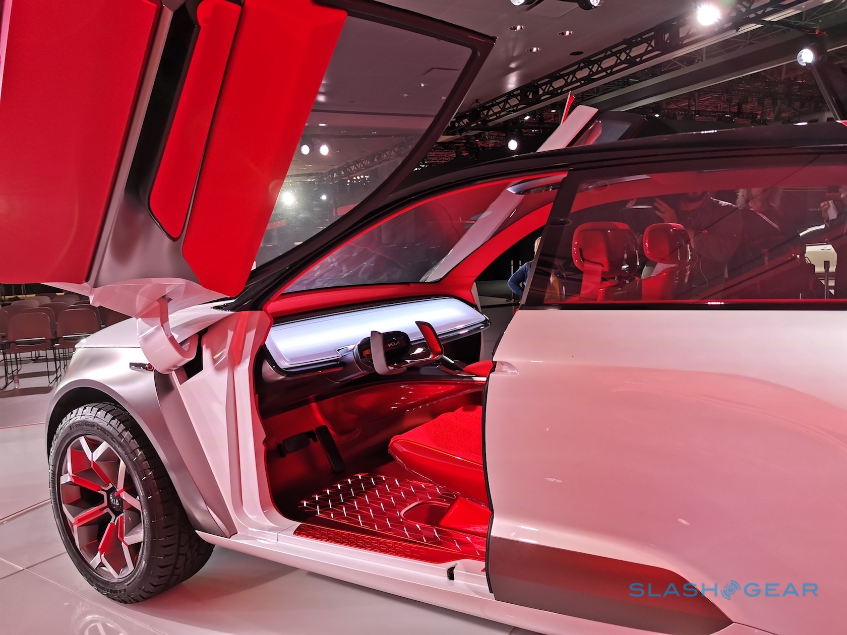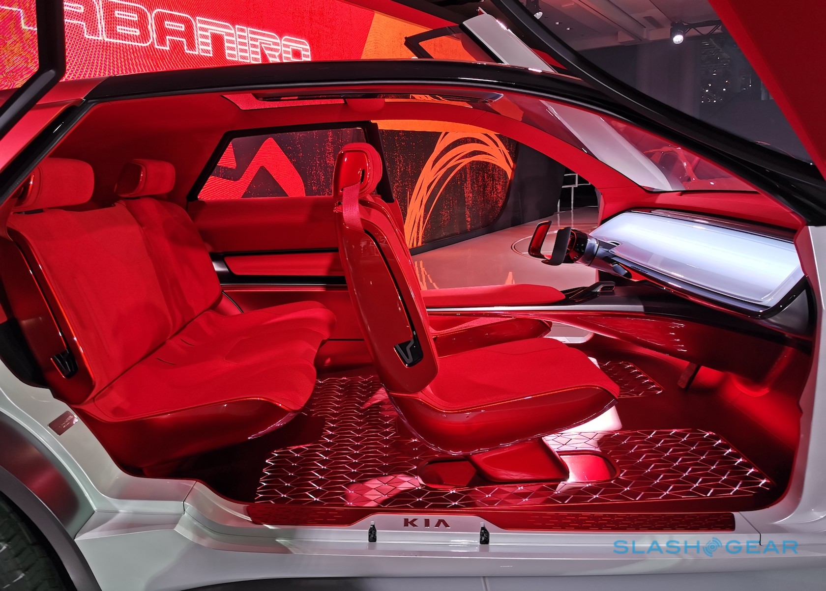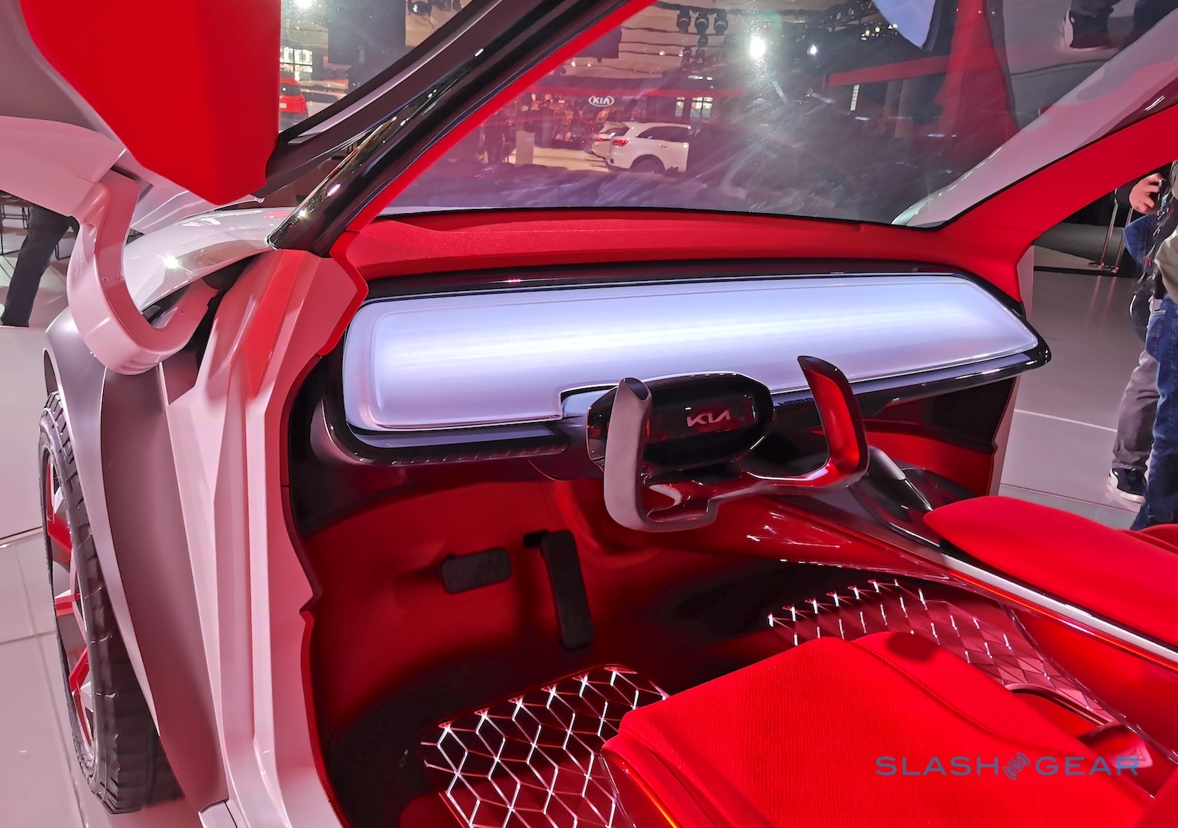 The beefy exterior opens up – via huge butterfly hinge doors – to expose a bright red cabin. That has floating seats and a notable absence of traditional controls. Instead, Kia envisages a windshield-spanning head-up display showing all the graphics you need, its 3D interfaace controlled by a concave touchpad.