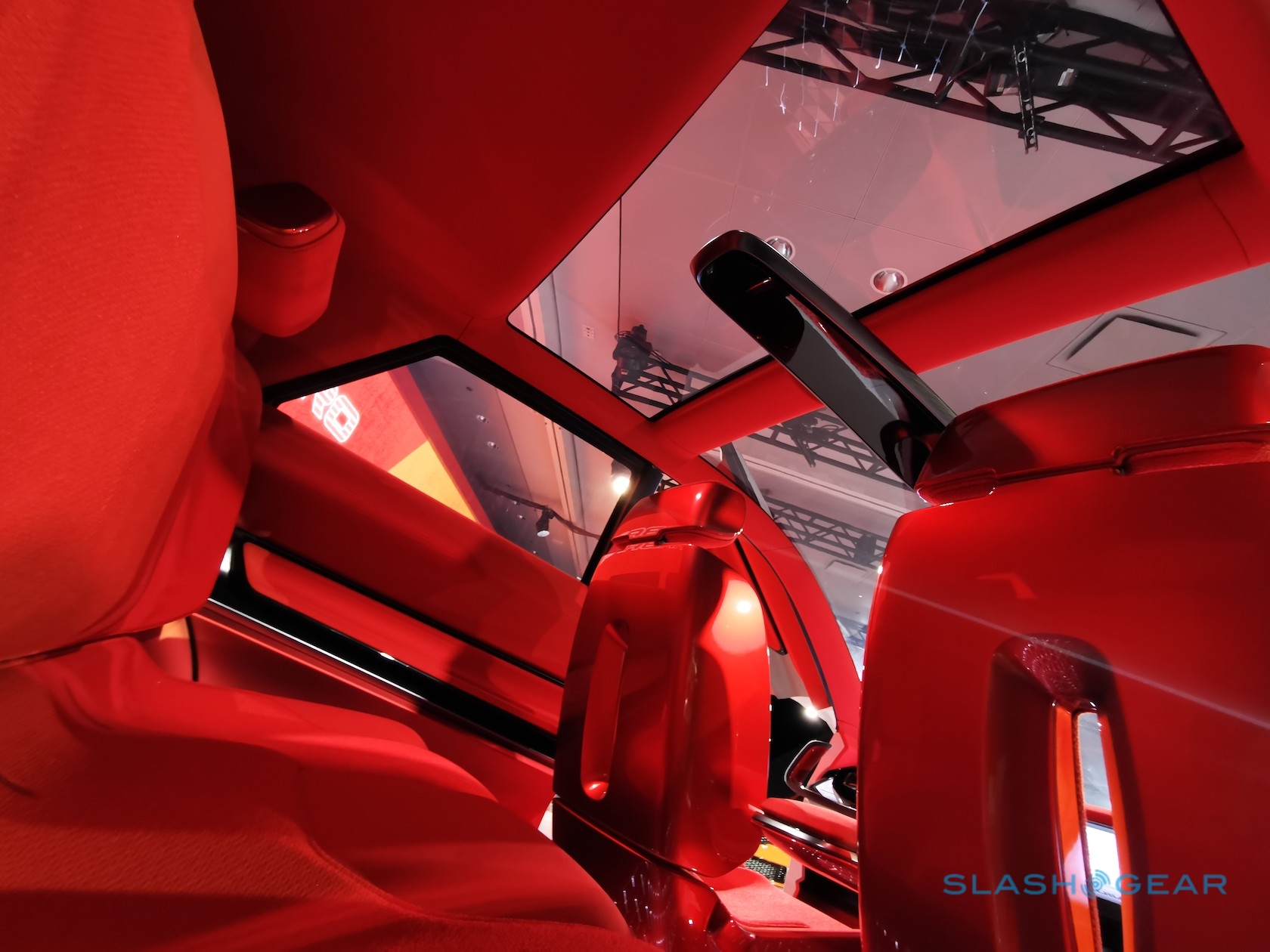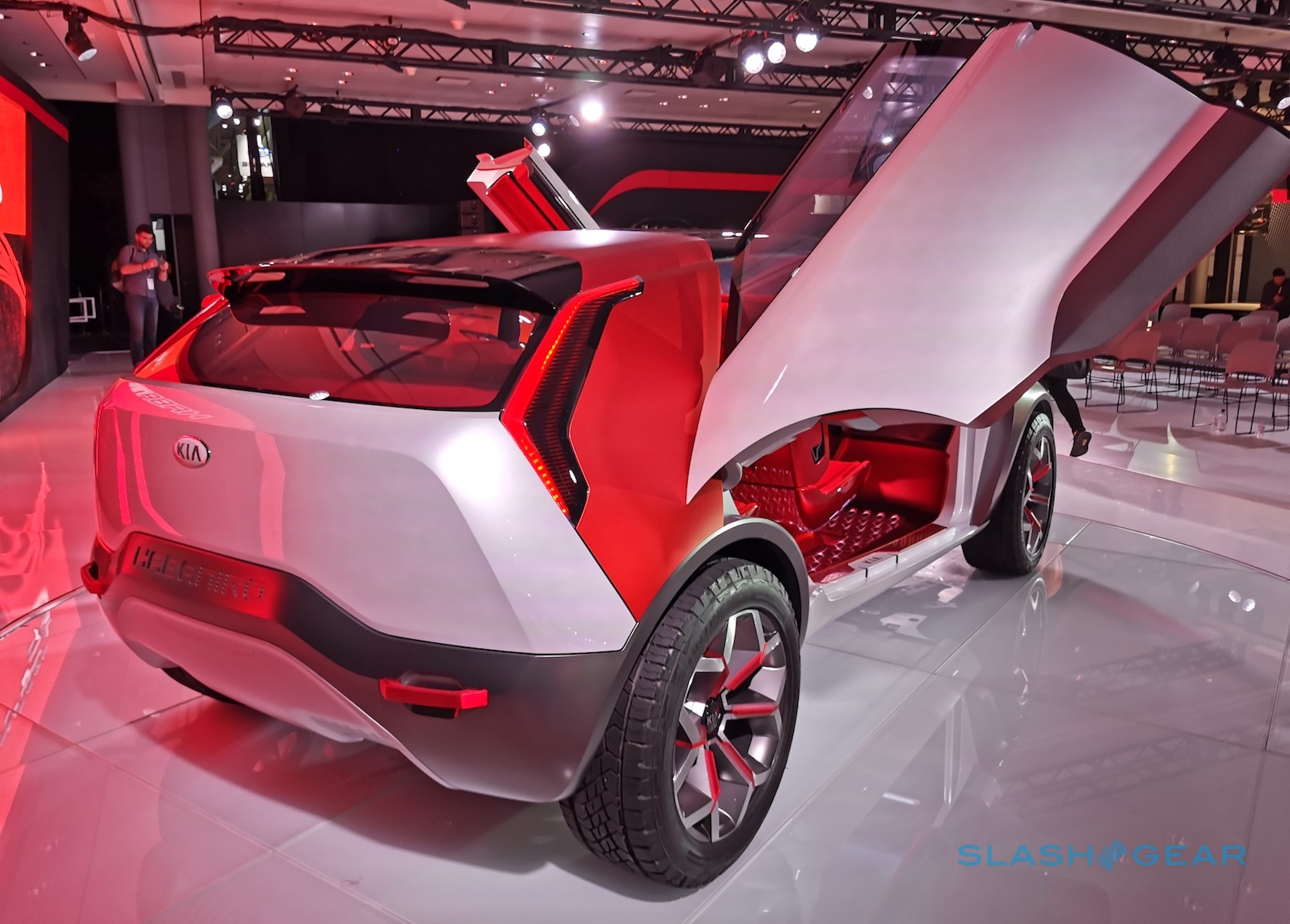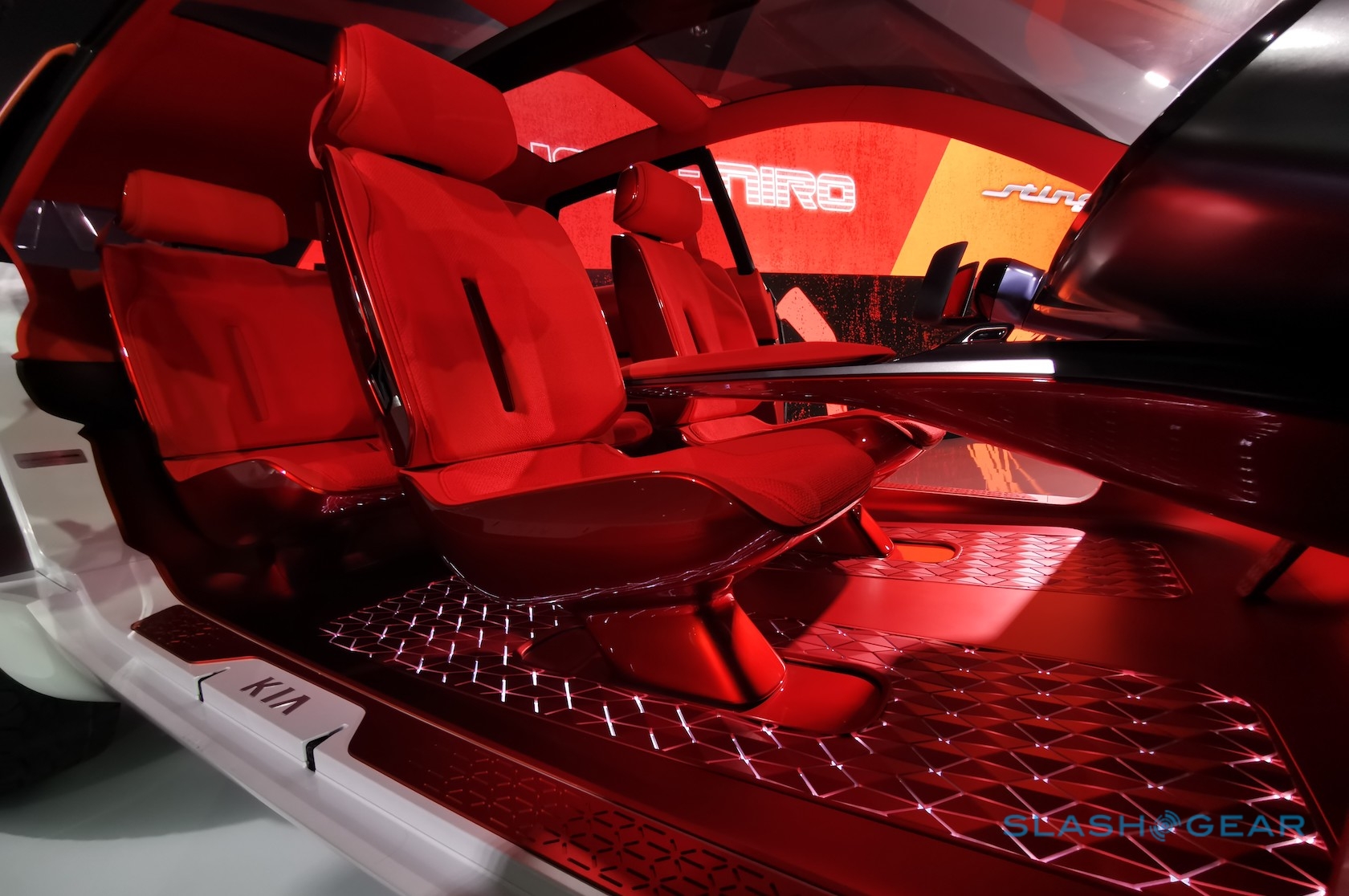 The beefy exterior opens up – via huge butterfly hinge doors – to expose a bright red cabin. That has floating seats and a notable absence of traditional controls. Instead, Kia envisages a windshield-spanning head-up display showing all the graphics you need, its 3D interfaace controlled by a concave touchpad.