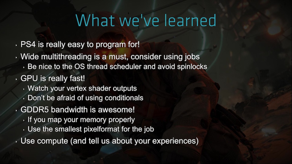 "PS4 is really easy to program for!" lead tech Michal Valient concludes, and the "GPU is really fast" while "GDDR5 bandwith is awesome" assuming you handle the memory mapping properly. "We've only scratched the surface" he says.
