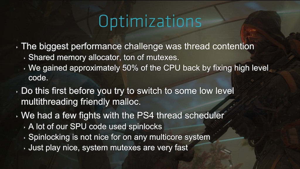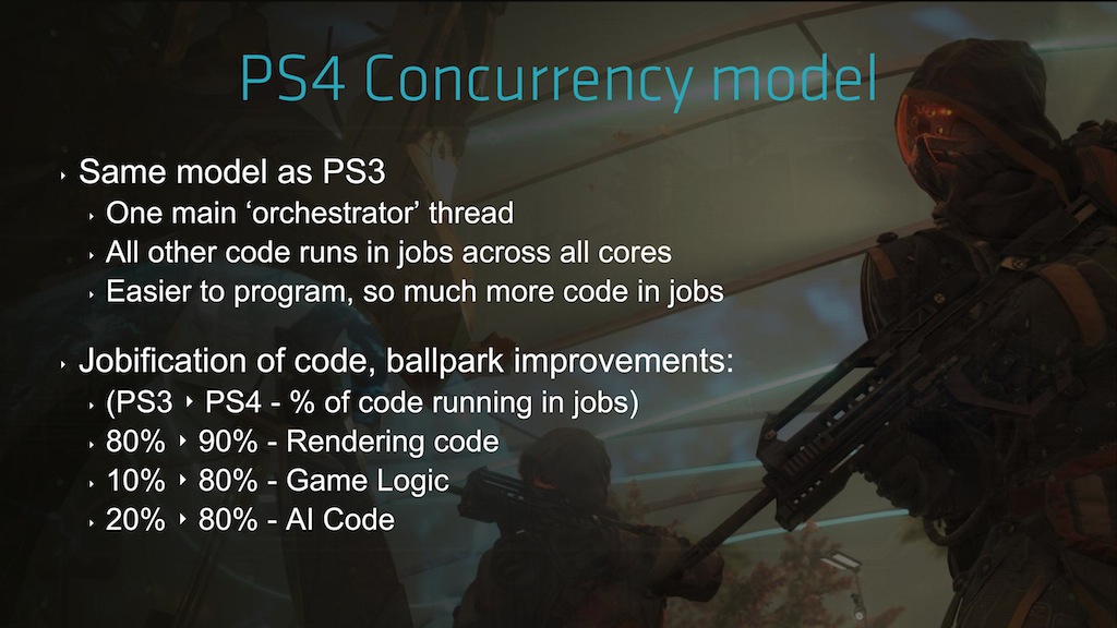 Much of the summary is dedicated to how much more straightforward it is to develop titles for the PS4. The console uses the same concurrency model as the PS3, for instance, with a main "orchestrator" thread and then the rest of the code running in jobs across all the cores; on the PS4, though, Guerrilla found that 80-percent of all code could now be run in jobs, versus 20-percent on the current-gen console.