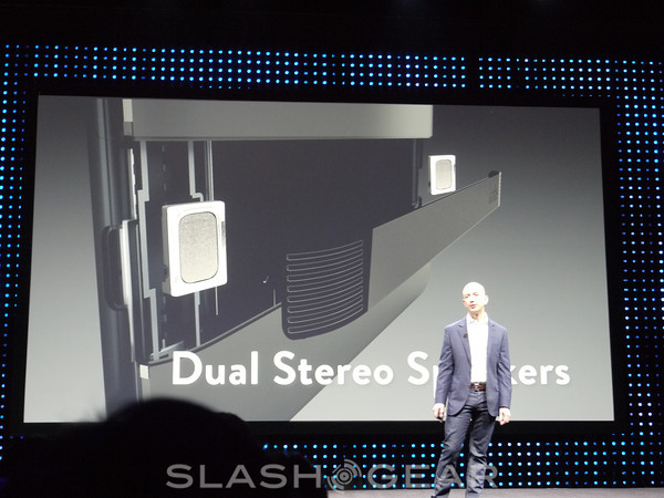 This new set of tablets works with dual stereo speakers rather than the single-speaker setup that most tablets have. Amazon isn't shy about showing the iPad here, as it does indeed have just one spot on its back with a speaker. With the Kindle Fire HD line you'll be working with Dolby Digital Plus sound – here an exclusive audio engine made just for this Kindle Fire HD lineup.