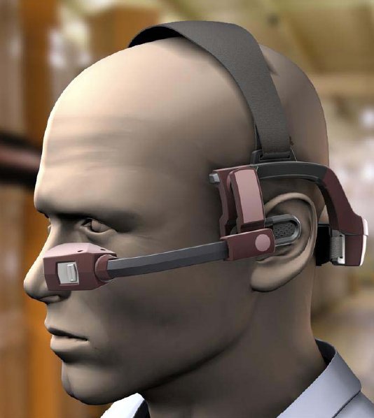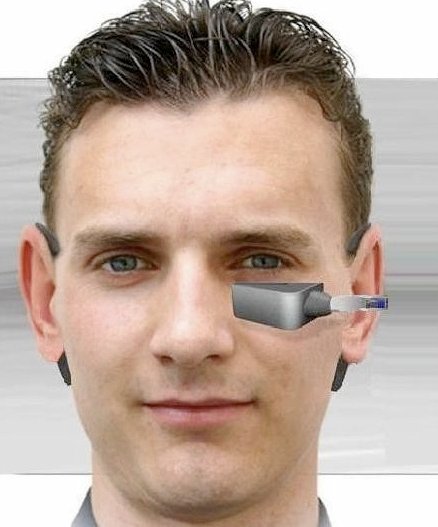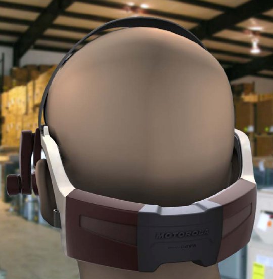 Kopin have come up with a head-mounted "virtual 15-inch display" to show off their new CyberDisplay micro-panel, a 0.6-inch screen capable of 800 x 600 resolution. The Kopin Golden-i concept – which they've given Motorola branding – integrates the CyberDisplay into a swing-down boom arm, linked to a hefty Bluetooth headset running Windows CE 6.0 R2 and supporting voice-recognition.Video demo after the cut