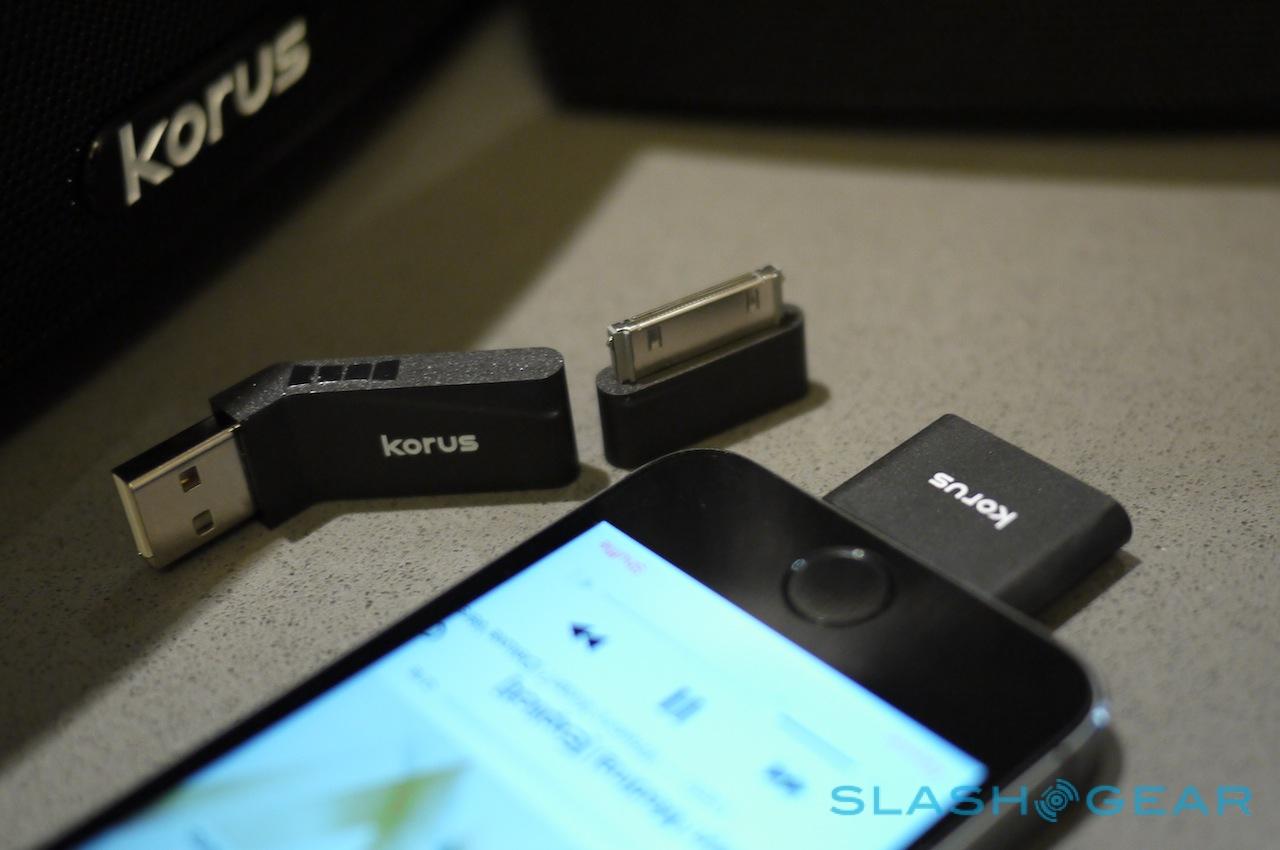 On the downside, it means that support isn't built into your iPhone or iPad. Instead, Korus offers plug-in dongles, which it calls Batons: there are Lightning and 30-pin Dock Connector options for mobile devices, along with a USB version for your laptop or desktop. There's no version for an Android or other device, yet, however, though Korus says one is due to arrive in 2014.