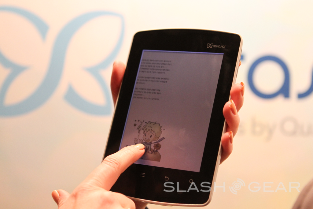 Here at CES 2012 is the Qualcomm Mirasol color e-paper technology. We've seen this before with the Kyobo eReader that is currently available in South Korea, but today we received some hands-on time with it for the first time in the US. This color e-paper technology is delivering unrivaled battery life to eReaders lasting up to 3 weeks while running on Android 2.3 Gingerbread. Check out or hands-on below.