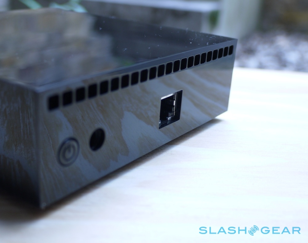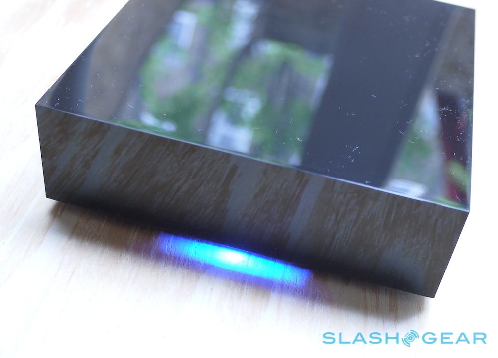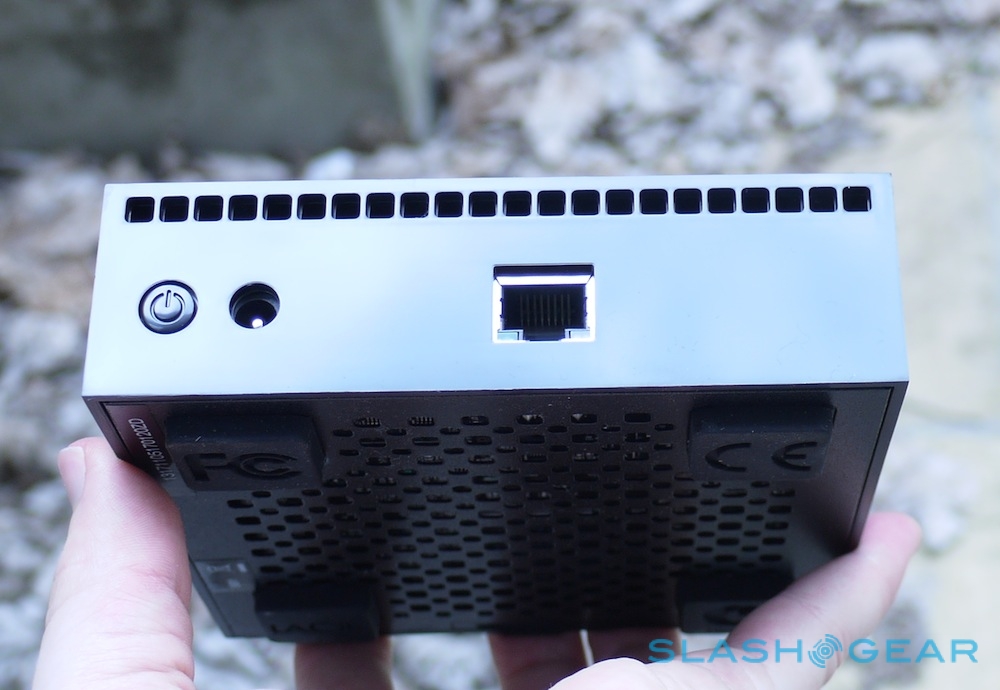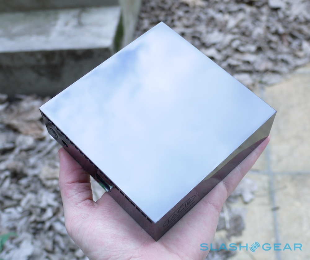 LaCie's favorite designer, Neil Poulton, does the honors with the CloudBox, though the external drive itself is probably more a case of what was left out than what's been included. A compact 4.6 x 4.6 x 1.5 inch black plastic box, the only real elements of interest are the recessed status LED in a notch under the leading edge (which flickers blue with varying degrees of frequency while active, and red when frustrated) along with a gigabit ethernet port, power input and button on the back, the latter the only physical control and used to turn the CloudBox on or off.
