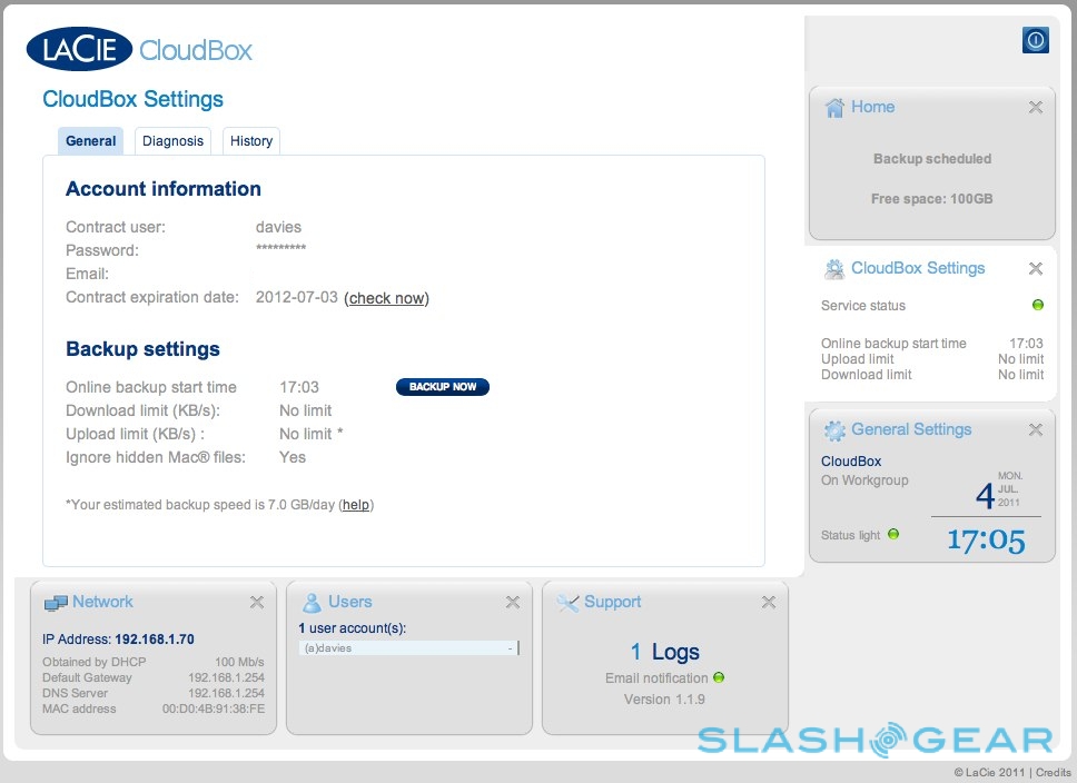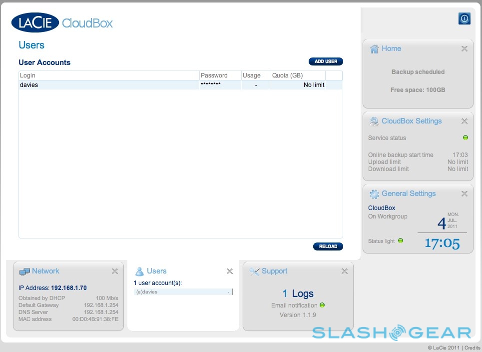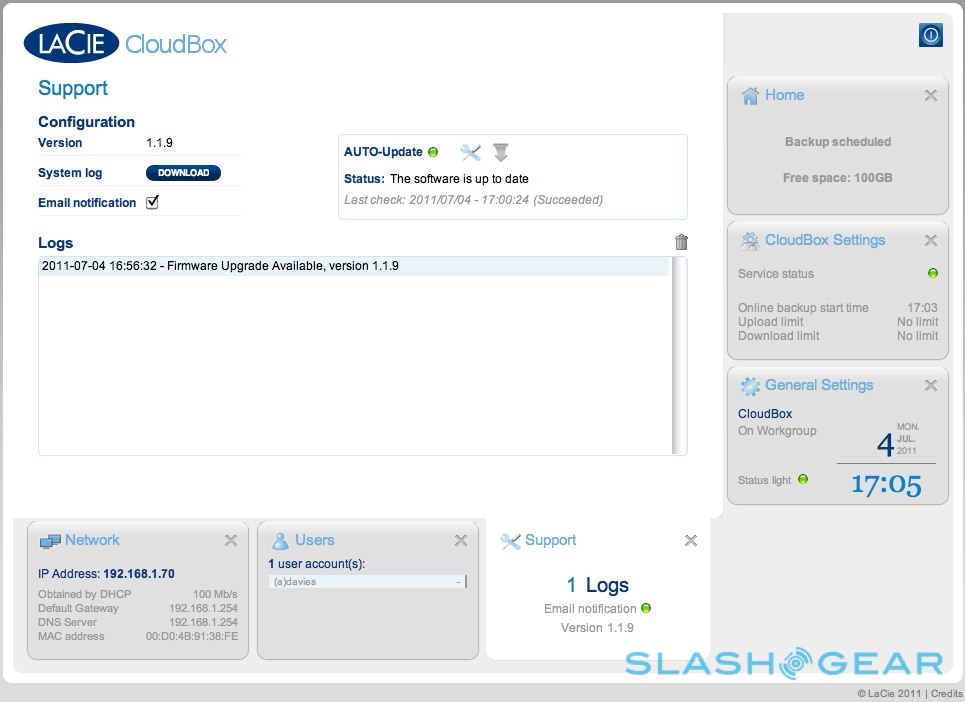 There are plenty more settings to be tinkered with in the LaCie CloudBox dashboard, however, including a simple counter showing how many out of the 100GB have been done, and when the most recent cloud upload took place. Some network information, details on user accounts – you can set up multiple users, each having access to their own files but nobody else's, and optionally with a set quota of the total storage that they can use – together with log records, a countdown to when your cloud backup plan expires and the option to manually set upload and download speed limits so as not to saturate your broadband connection are also easily accessed.
