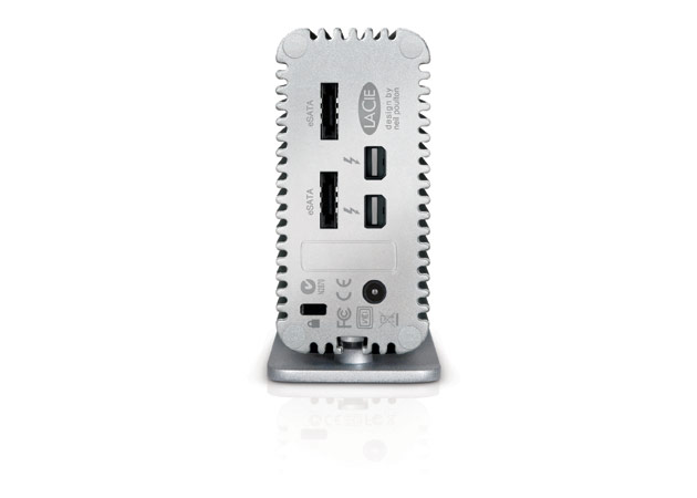 In the back of this device you'll find dual 10Gb/s Thunderbolt ports for daisy chaining, dual eSATA 3GB/s ports, a Kensington Lockm, and a power port – all of this on an enclosure which sits on a removable stand. You can daisy-chain up to six Thunderbolt technology compatible devices at once – LaCie brand suggested, but not required. YOu can also connect up to two eSATA drives (per hub.)