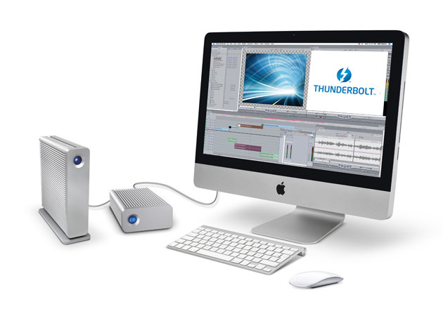 You've seen these eSATA drives popping up all of last year, they're the LaCie silver drives with the blue light that looks like HAL – Lacie's also been using this look for all of their ThunderBolt-ready peripherals for some time now. What this hub is able to do is bring your eSATA drives in on one box, here "unleashing" their full potential with the 10GB/s speeds of Thunderbolt.