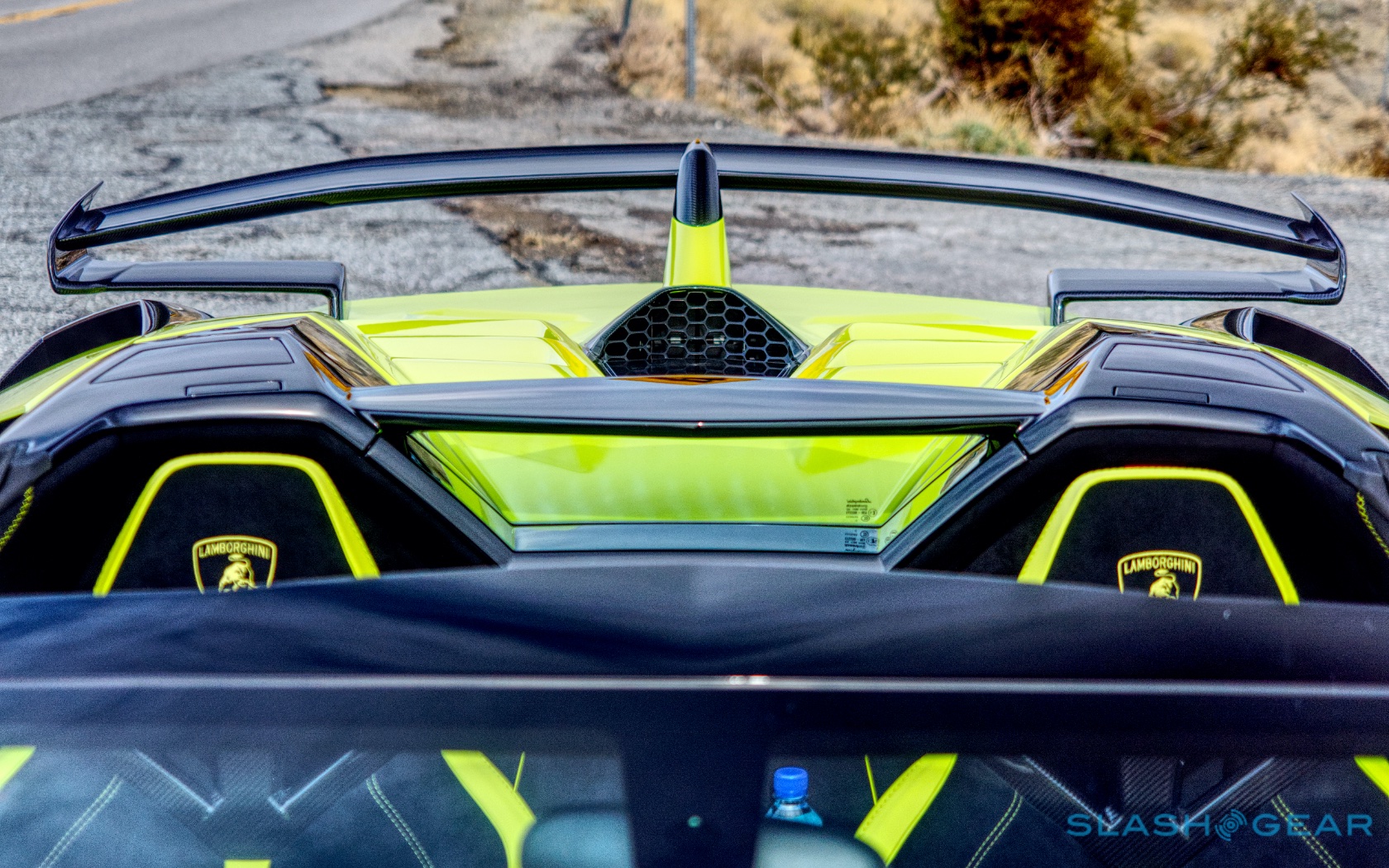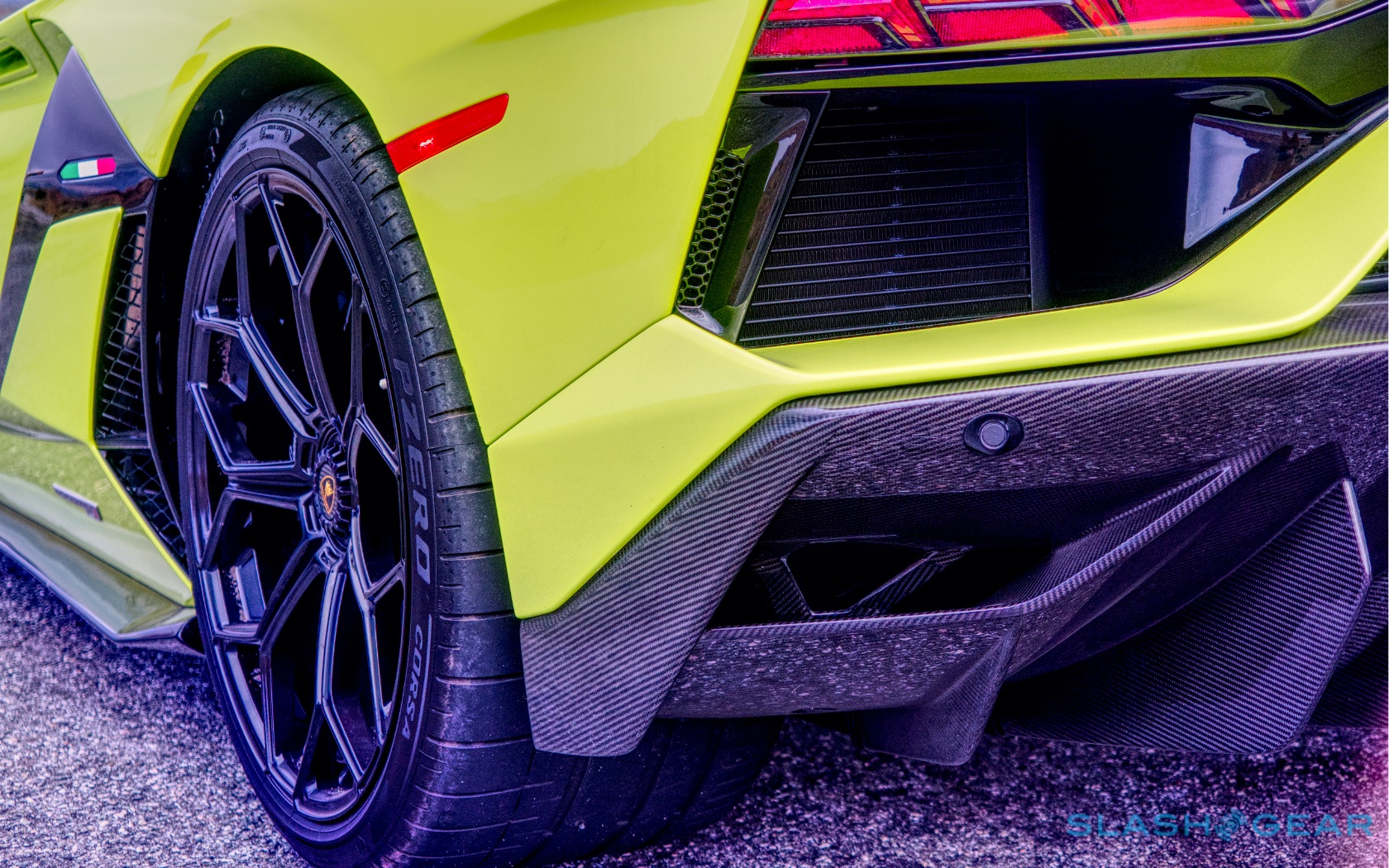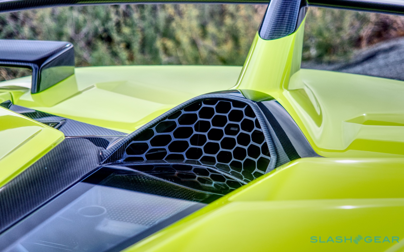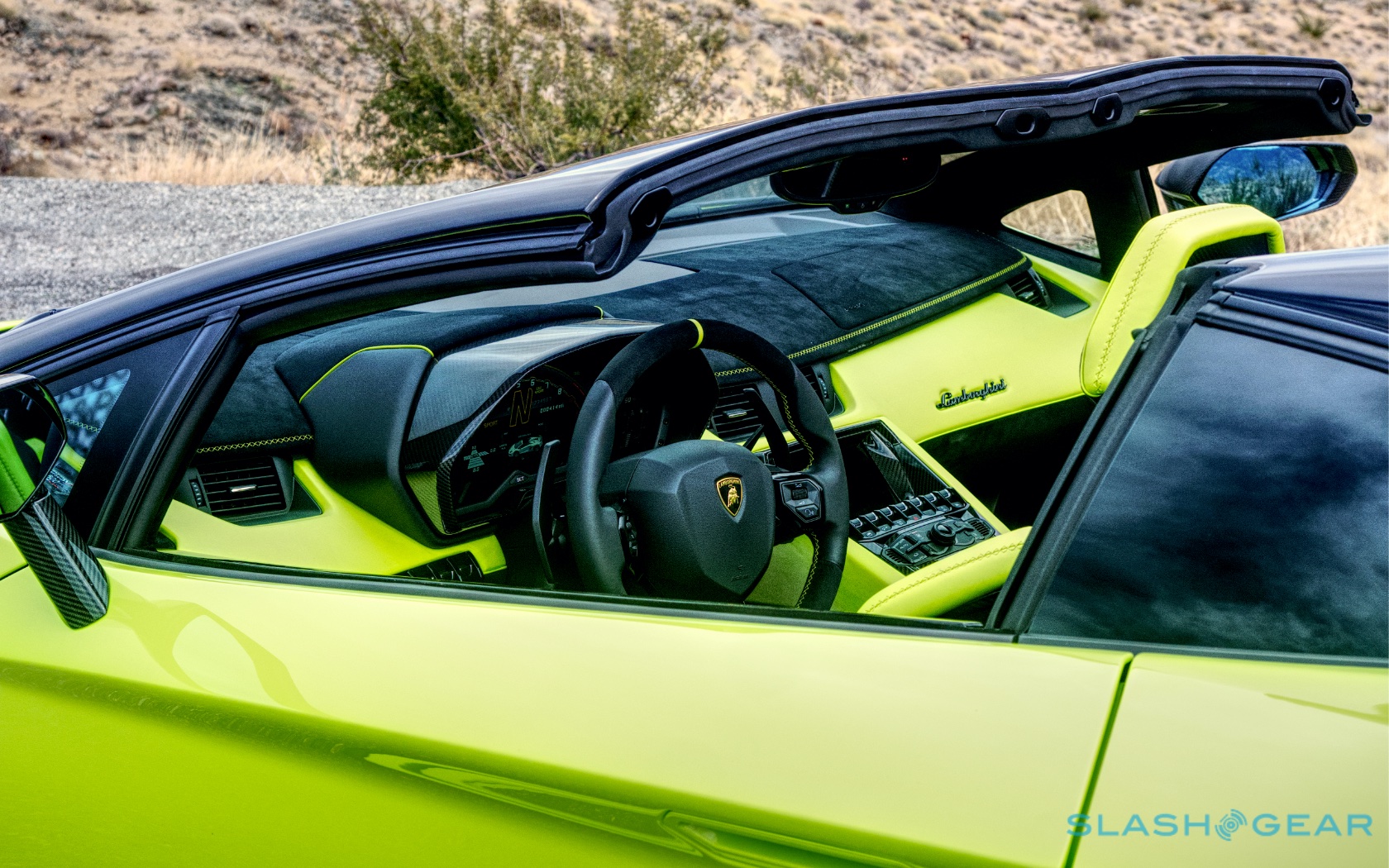Of course, the big difference here is the removable roof: carbon fiber panels that stow inside the front trunk. That way you get to really hear the 6.5-liter V12 engine howl, and howl it does. Nobody ever accused an Aventador of being subtle, but the SVJ Roadster cranks that up to legendary levels.