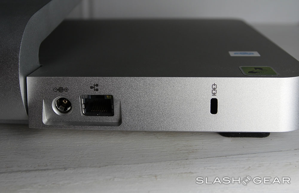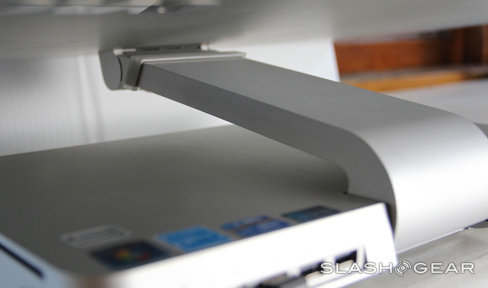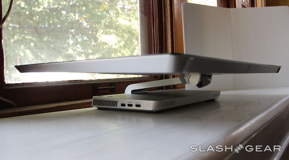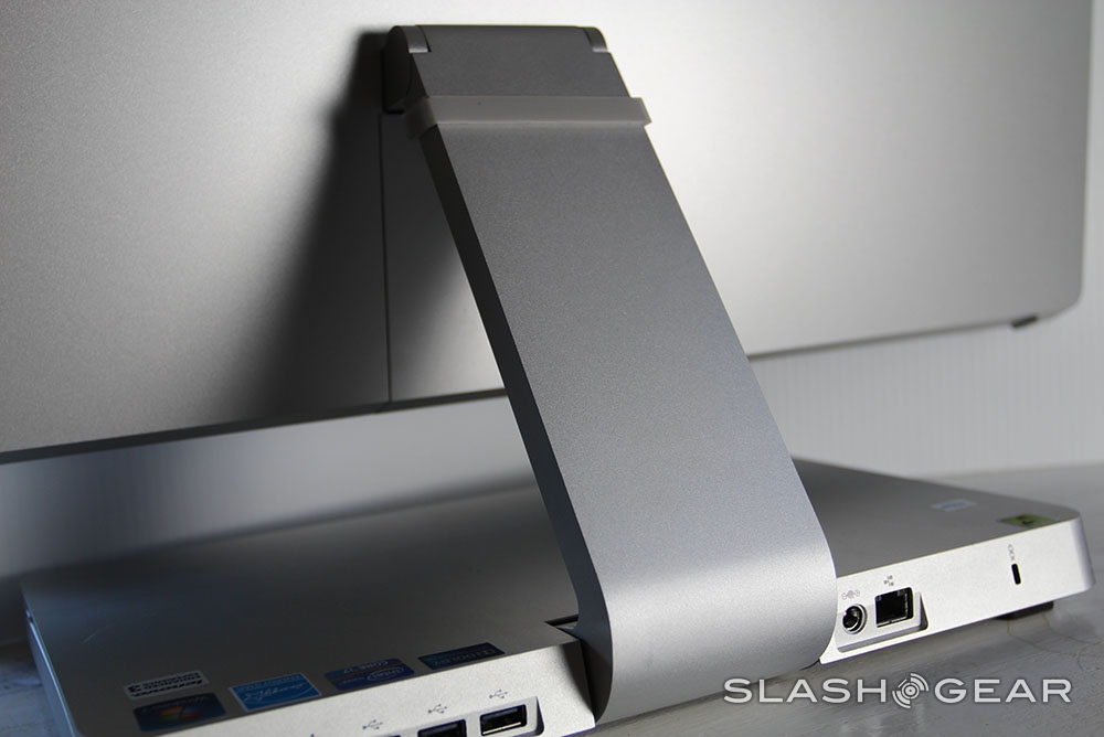 You also have one USB 3.0 port on that side and three USB 2.0 ports on the back. Also on the back is your power port and Ethernet port as well. Then there's your ability to adjust the display. The whole computer is massively heavy – ringing in at 11.6kg or 25.6 pounds. You'll be able to view the display anywhere between 90 degrees straight up and down and 0 degrees (flat). Moving the display (as demonstrated in our hands-on video below) is extremely easy yet keeps the machine tight in place wherever you want to leave it.