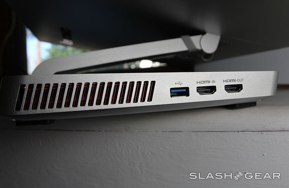 The bottom left of the machine has two HDMI ports, one in, one out. There you can connect with your smartphone – as most smartphones now have such a connection in one way or another, or you can push content out to a much more major-league HD display. In other words, you can make this computer the biggest wired remote control of all time!