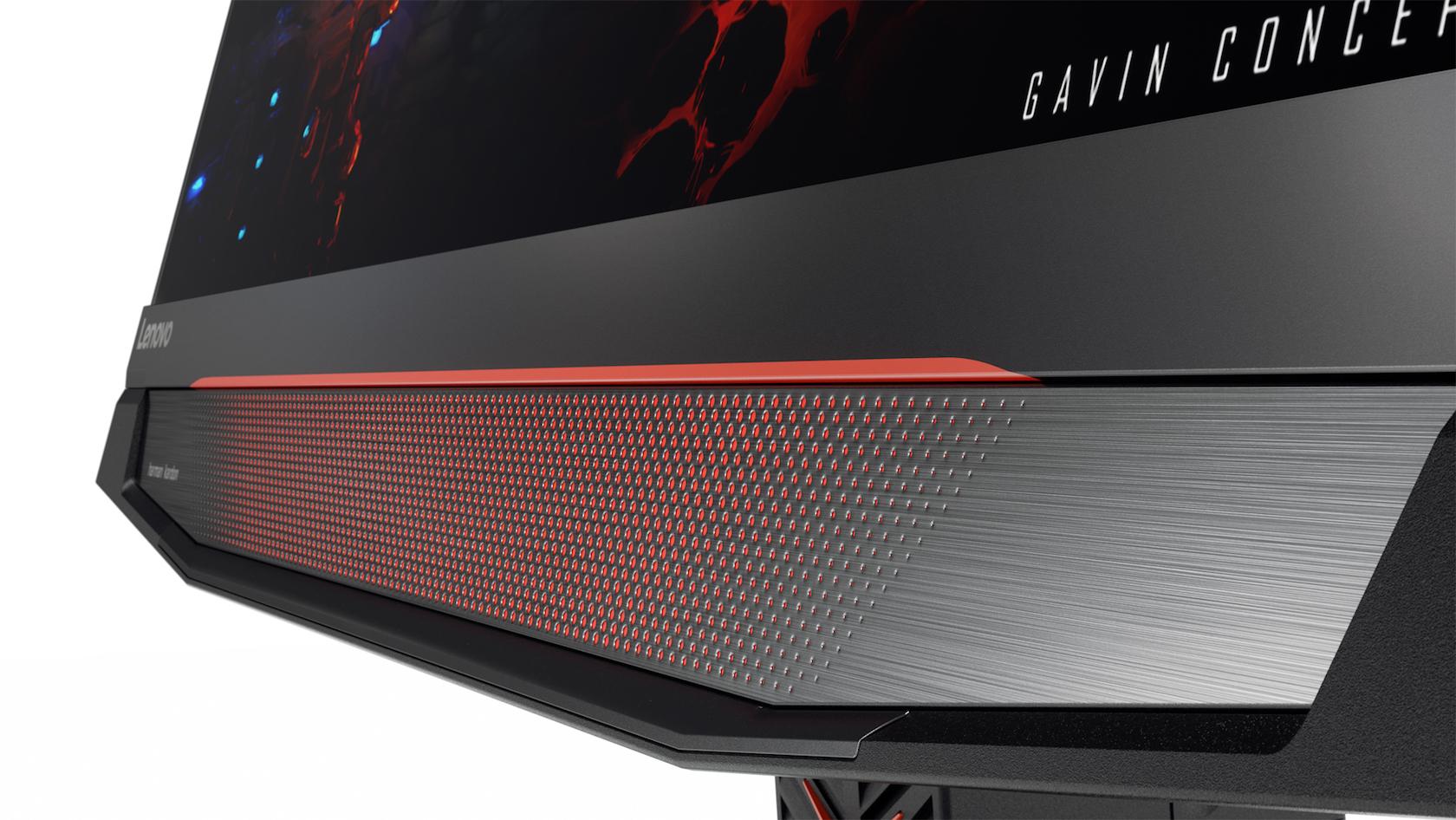 The display itself is a QHD 2560 x 1440 "borderless" panel, with 144Hz refresh rate and 5ms response time, which stretches almost to the very edges of the 24.24-inch wide chassis. Lenovo also found room for twin 5W Harmon Kardon stereo speakers, though there's 7.1 channel Dolby Audio support if you want to use external speakers.